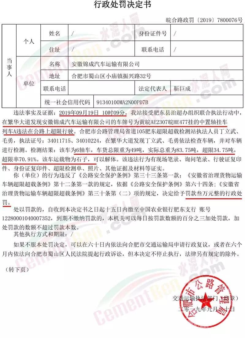 9月24日生效的《關(guān)于對(duì)安徽錦成汽車運(yùn)輸有限公司違法在公路上超限行駛進(jìn)行處罰的決定》(皖合路政罰〔2019〕7800076號(hào))中違法事實(shí)及證據(jù)提到2019年09月19日10時(shí)09分,我站接受肥東縣治超辦組織聯(lián)合執(zhí)法行動(dòng)中,在繁華大道發(fā)現(xiàn)安徽錦成汽車運(yùn)輸有限公司的車牌號(hào)為黃皖A(yù)E2307皖HE477掛的中置軸掛車列車A違法在公路上超限行駛。合肥市公路管理局省道105肥東超限超載檢測(cè)站執(zhí)法人員依法檢查車輛,并對(duì)車輛進(jìn)行檢測(cè)。檢測(cè)結(jié)果:該車為6軸車,車貨總限重為49噸,實(shí)際總重為83.75噸,超限34.75噸,超限率70.91%。該車運(yùn)載物為石子,可以解體。上述行為違反了《公路安全保護(hù)條例》第三十三條第一款;《安徽省治理貨物運(yùn)輸車輛超限超載條例》第十二條第一款的規(guī)定,依據(jù)《公路安全保護(hù)條例》第六十四條;《安徽省治理貨物運(yùn)輸車輛超限超載條例》第三十條第(二)項(xiàng)的規(guī)定,決定給予罰款叁萬(wàn)元整的行政處罰。