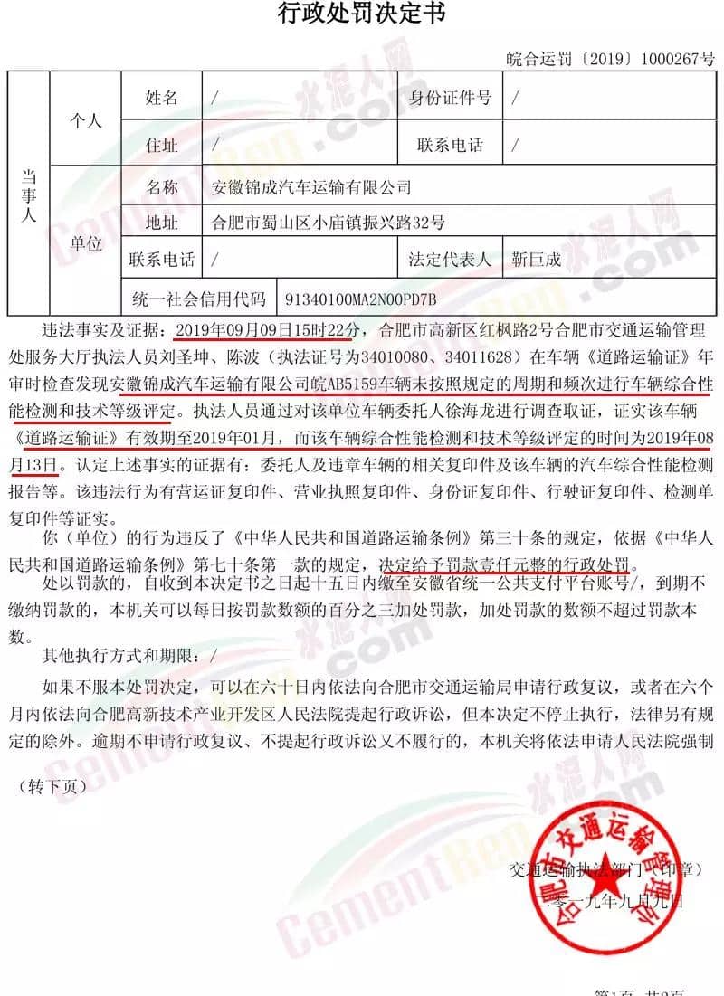 合肥市政府信息公開網(wǎng)9月12日公開信息《安徽錦成汽車運(yùn)輸有限公司不按規(guī)定維護(hù)和檢測(cè)運(yùn)輸車輛的案》提到:2019年09月09日15時(shí)22分,合肥市高新區(qū)紅楓路2號(hào)合肥市交通運(yùn)輸管理處服務(wù)大廳執(zhí)法人員劉圣坤、陳波(執(zhí)法證號(hào)為34010080、34011628)在車輛《道路運(yùn)輸證》年審時(shí)檢查發(fā)現(xiàn)安徽錦成汽車運(yùn)輸有限公司皖A(yù)B5159車輛未按照規(guī)定的周期和頻次進(jìn)行車輛綜合性能檢測(cè)和技術(shù)等級(jí)評(píng)定。執(zhí)法人員通過(guò)對(duì)該單位車輛委托人徐海龍進(jìn)行調(diào)查取證,證實(shí)該車輛《道路運(yùn)輸證》有效期至2019年01月,而該車輛綜合性能檢測(cè)和技術(shù)等級(jí)評(píng)定的時(shí)間為2019年08月13日。因上述單位的行為違反了《中華人民共和國(guó)道路運(yùn)輸條例》第三十條的規(guī)定,依據(jù)《中華人民共和國(guó)道路運(yùn)輸條例》第七十條第一款的規(guī)定,決定給予罰款壹仟元整的行政處罰。