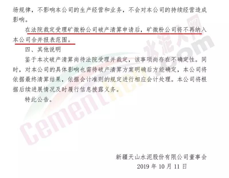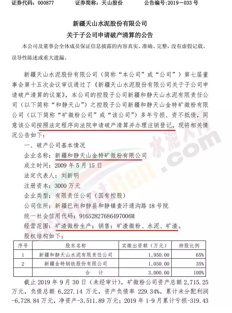 昨日晚間,天山股份公告稱:新疆天山水泥股份有限公司第七屆董事會第十五次會議審議通過了《新疆天山水泥股份有限公司關(guān)于子公司申請破產(chǎn)清算的議案》,本公司的控股子公司新疆和靜天山水泥有限責(zé)任公司(以下簡稱“和靜天山”)之控股子公司新疆和靜天山金特礦微粉有限公司(以下簡稱“礦微粉公司”或“該公司”)多年虧損、資不抵債,同意該公司按照法定程序向法院申請破產(chǎn)清算并辦理注銷登記。