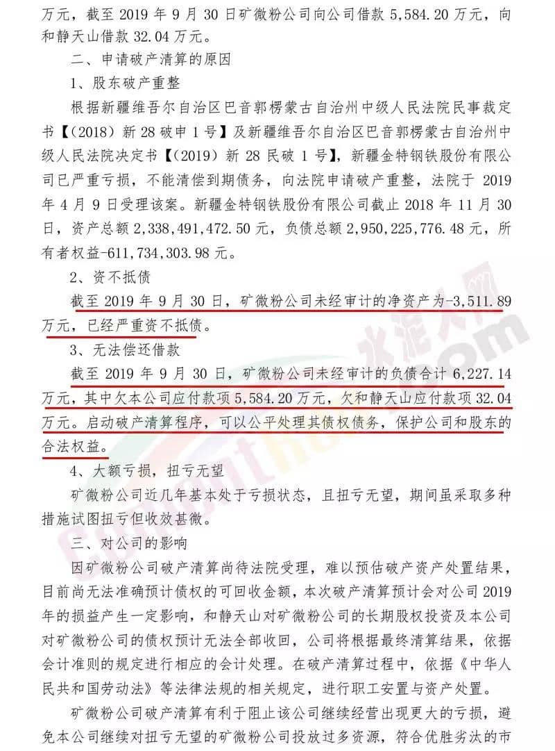 申請破產(chǎn)清算的原因1、股東破產(chǎn)重整根據(jù)新疆維吾爾自治區(qū)巴音郭楞蒙古自治州中級人民法院民事裁定書【(2018)新 28 破申 1 號】及新疆維吾爾自治區(qū)巴音郭楞蒙古自治州中級人民法院決定書【(2019)新 28 民破 1 號】,新疆金特鋼鐵股份有限公司已嚴(yán)重虧損,不能清償?shù)狡趥鶆?wù),向法院申請破產(chǎn)重整,法院于 2019年 4 月 9 日受理該案。新疆金特鋼鐵股份有限公司截止 2018 年 11 月 30日,資產(chǎn)總額 2,338,491,472.50 元,負(fù)債總額 2,950,225,776.48 元,所有者權(quán)益-611,734,303.98 元。2、資不抵債截至 2019 年 9 月 30 日,礦微粉公司未經(jīng)審計(jì)的凈資產(chǎn)為-3,511.89萬元,已經(jīng)嚴(yán)重資不抵債。3、無法償還借款截至 2019 年 9 月 30 日,礦微粉公司未經(jīng)審計(jì)的負(fù)債合計(jì) 6,227.14萬元,其中欠本公司應(yīng)付款項(xiàng) 5,584.20 萬元,欠和靜天山應(yīng)付款項(xiàng) 32.04萬元。啟動破產(chǎn)清算程序,可以公平處理其債權(quán)債務(wù),保護(hù)公司和股東的合法權(quán)益。4、大額虧損,扭虧無望礦微粉公司近幾年基本處于虧損狀態(tài),且扭虧無望,期間雖采取多種措施試圖扭虧但收效甚微。對公司的影響因礦微粉公司破產(chǎn)清算尚待法院受理,難以預(yù)估破產(chǎn)資產(chǎn)處置結(jié)果,目前尚無法準(zhǔn)確預(yù)計(jì)債權(quán)的可回收金額,本次破產(chǎn)清算預(yù)計(jì)會對公司 2019年的損益產(chǎn)生一定影響,和靜天山對礦微粉公司的長期股權(quán)投資及本公司對礦微粉公司的債權(quán)預(yù)計(jì)無法全部收回,公司將根據(jù)最終清算結(jié)果,依據(jù)會計(jì)準(zhǔn)則的規(guī)定進(jìn)行相應(yīng)的會計(jì)處理。在破產(chǎn)清算過程中,依據(jù)《中華人民共和國勞動法》等法律法規(guī)的相關(guān)規(guī)定,進(jìn)行職工安置與資產(chǎn)處置。礦微粉公司破產(chǎn)清算有利于阻止該公司繼續(xù)經(jīng)營出現(xiàn)更大的虧損,避免本公司繼續(xù)對扭虧無望的礦微粉公司投放過多資源,符合優(yōu)勝劣汰的市場規(guī)律,不影響本公司的生產(chǎn)經(jīng)營和業(yè)務(wù),不會對本公司的持續(xù)經(jīng)營造成影響。在法院裁定受理礦微粉公司破產(chǎn)清算申請后,礦微粉公司將不再納入本公司合并報(bào)表范圍。公告原文如下: