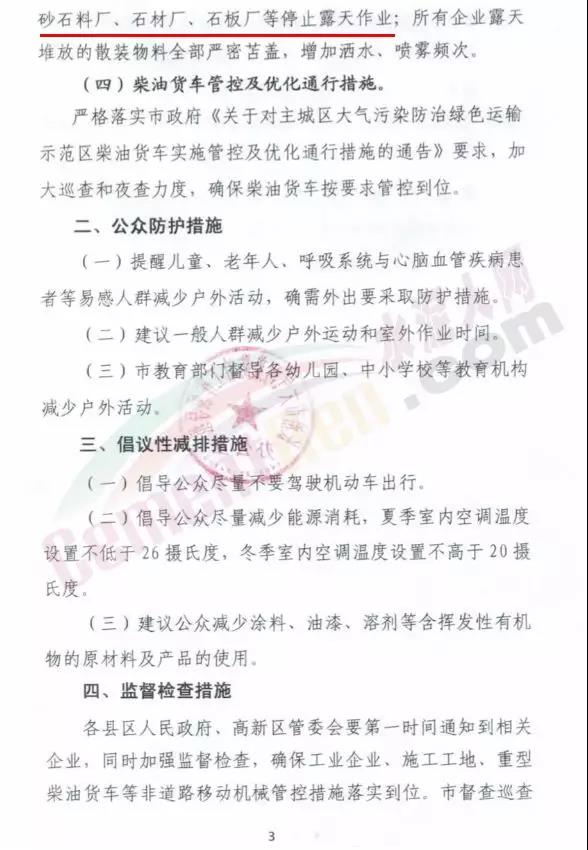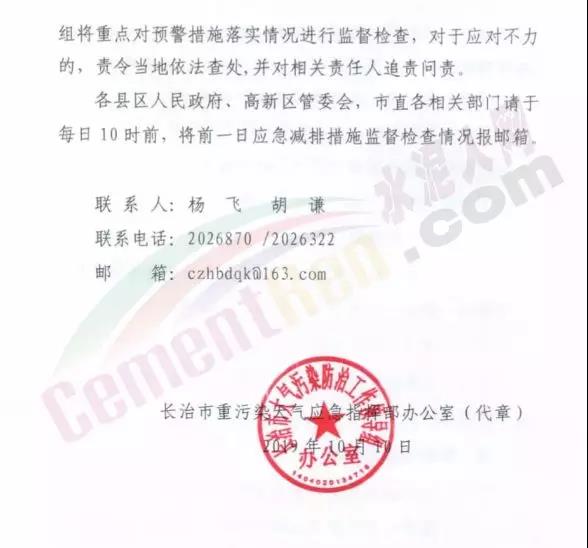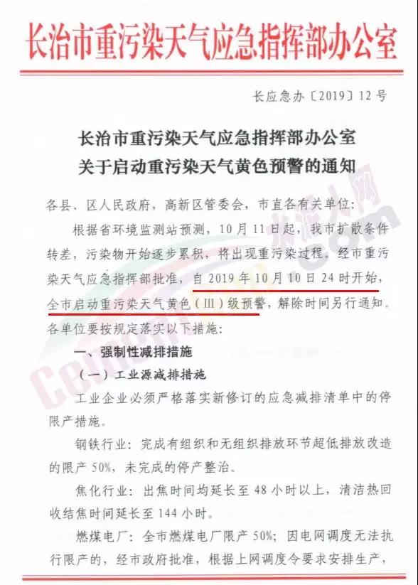 日前,長治市重污染天氣應(yīng)急指揮部辦公室發(fā)布啟動重污染天氣黃色預(yù)警的通知,要求自10月10日24時(shí)起,全市啟動 重污染天氣黃色預(yù)警。要求轄區(qū)內(nèi)水泥行業(yè)停產(chǎn)、采石采砂行業(yè)停產(chǎn)、國四以下車輛禁運(yùn)、礦山、砂石料廠等停止作業(yè)。通知原文如下:
