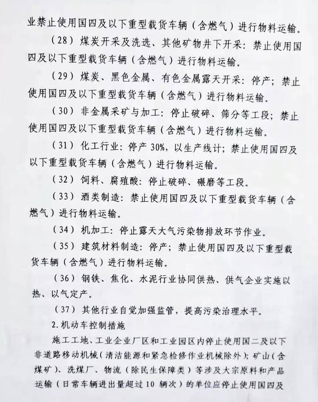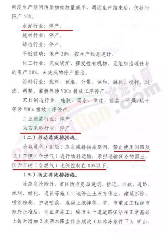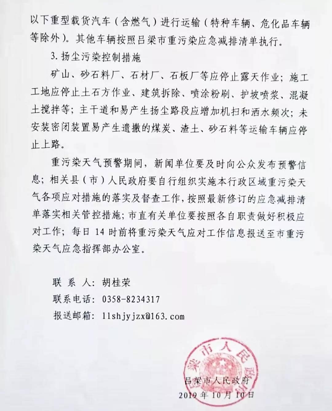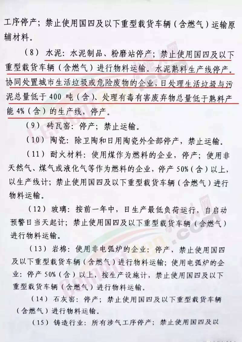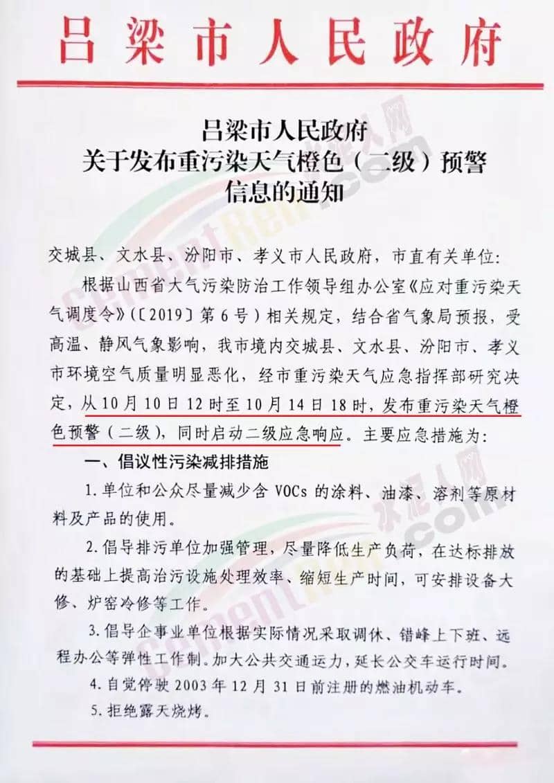 同期,呂梁市人民政策亦發(fā)布了重污染天氣橙色預(yù)警通知。通知稱自10月10日12時(shí)對10月14日18時(shí),發(fā)布重污染天氣橙色預(yù)警,同時(shí)啟動二級應(yīng)急響應(yīng)。工業(yè)企業(yè)強(qiáng)制減排措施要求水泥:水泥制品、粉磨站停產(chǎn);禁止使用國四及以下重型載貨車輛進(jìn)行物料運(yùn)輸。水泥熟料生產(chǎn)線停產(chǎn),協(xié)同處置城市 生活垃圾或危廢的企業(yè),日處理生活垃圾與污泥總量低于400噸、處理危廢總量低于熟料產(chǎn)能4%的生產(chǎn)線停產(chǎn)。通知全文如下: