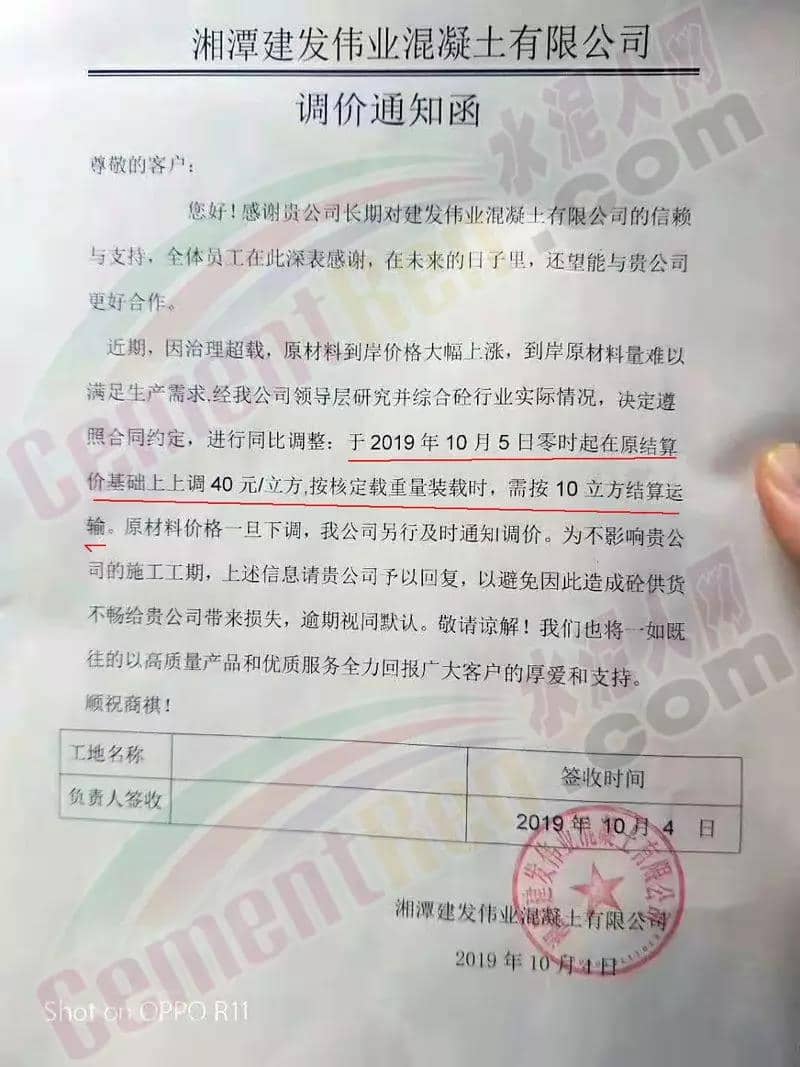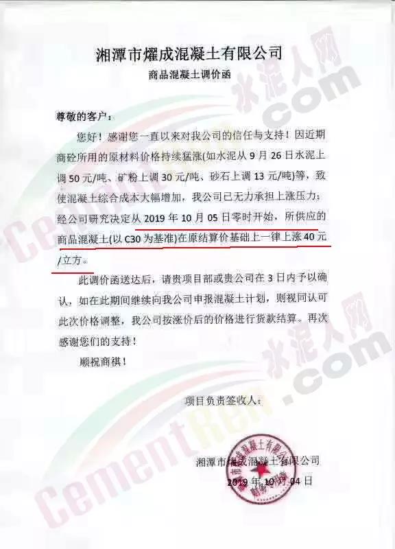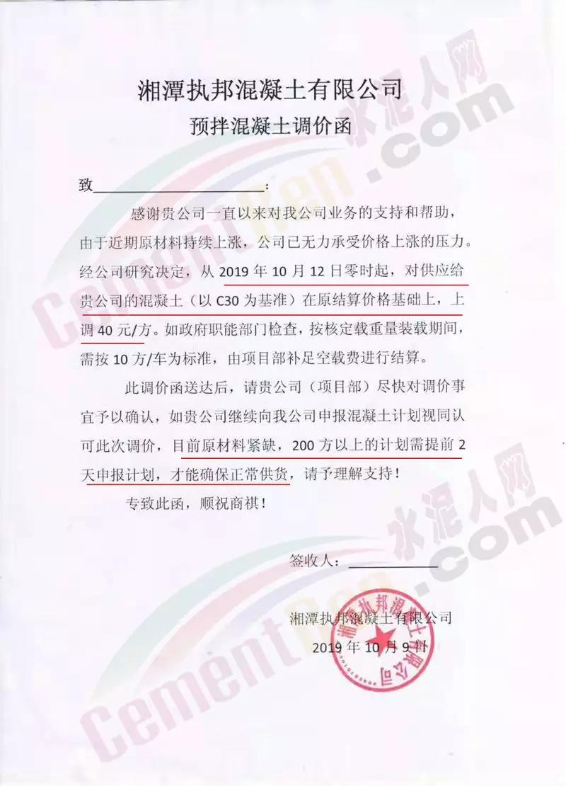 或受上述因素影響,湖南部分區(qū)域混凝土企業(yè)通知上調(diào)砼產(chǎn)品價格。其中湘潭執(zhí)邦混凝土有限公司預拌混凝土調(diào)價函稱,自10月12日零時起,C30上調(diào)40元/方,且200方以上的計劃需提前兩天申請。