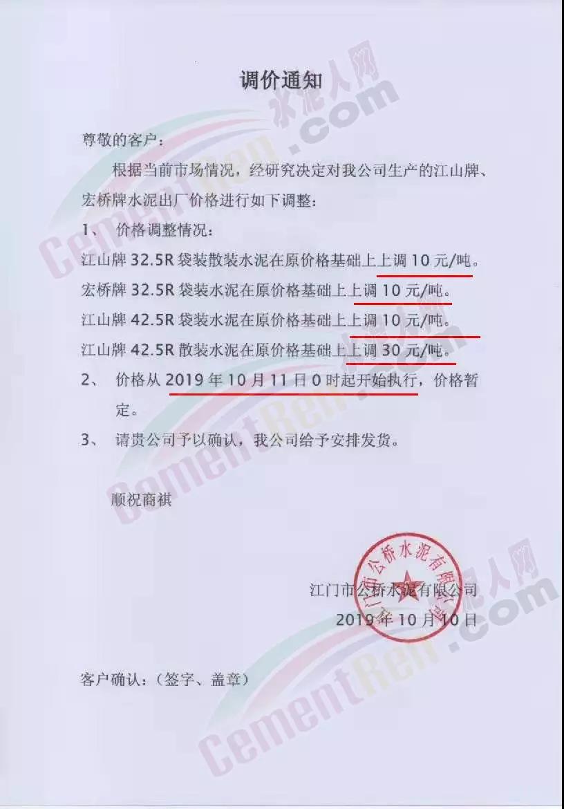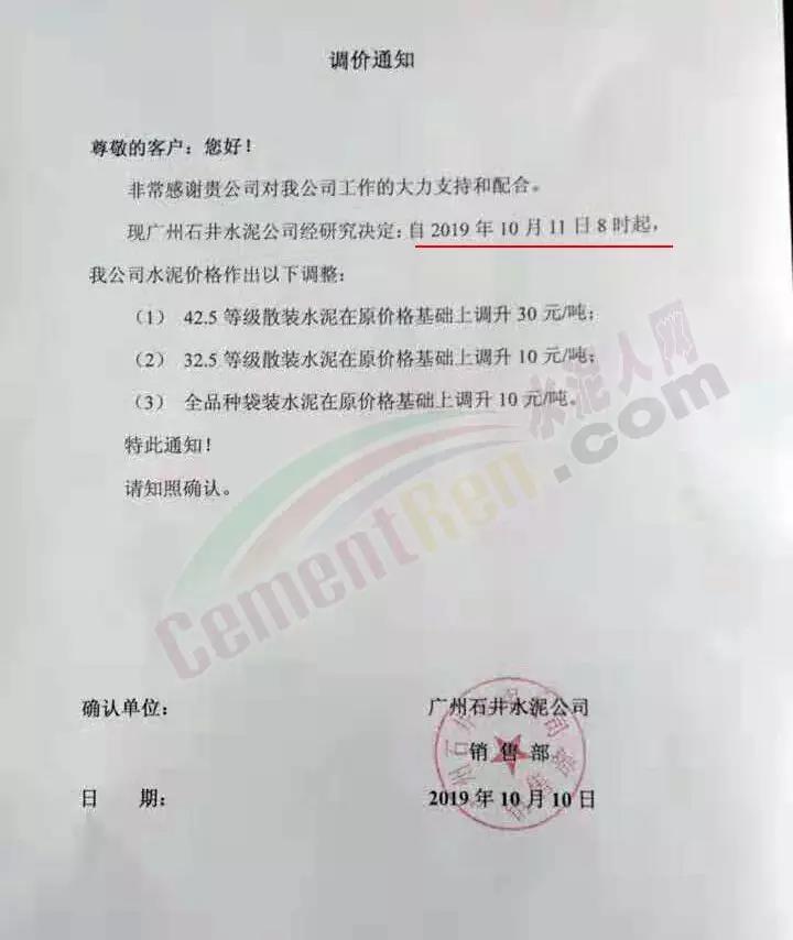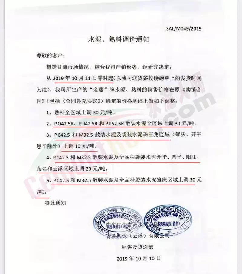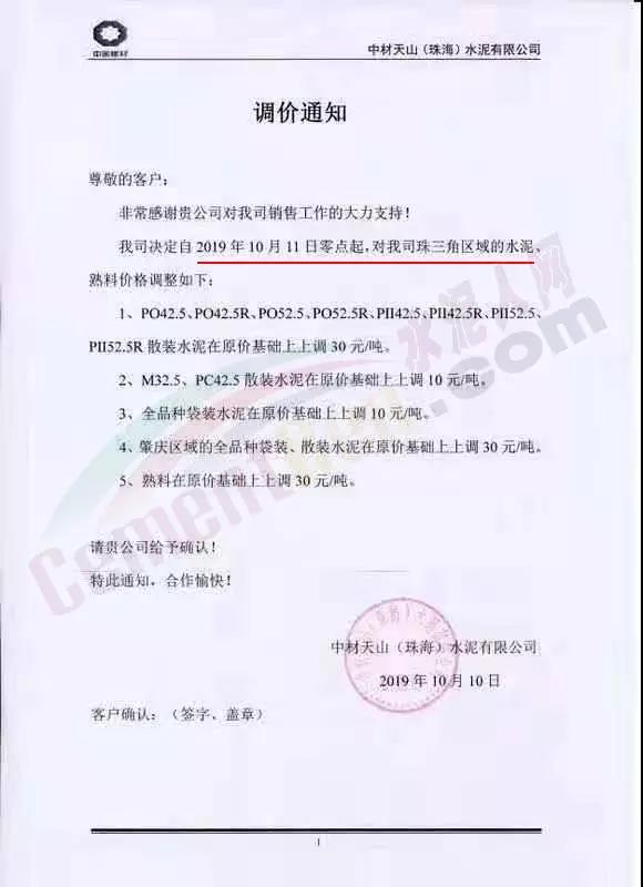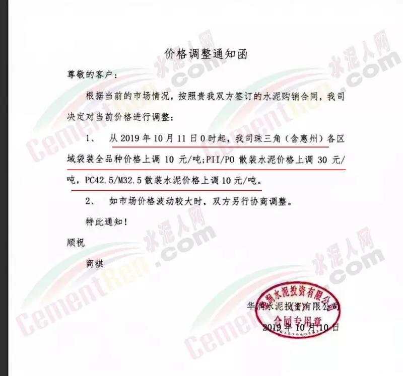 水泥企業(yè)主方面,華南珠三角珠海海中貿(mào)易公司通知稱,根據(jù)當前行情公司的產(chǎn)銷形勢,于10月起上調(diào)出廠價格30元/噸。