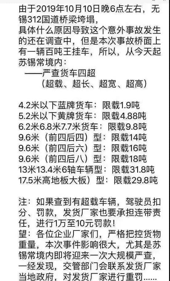 另外一個(gè)原因是由于市場競爭因素,現(xiàn)有的重載貨車如果不超載很難盈利。這在如今去產(chǎn)能、制造業(yè)競爭壓力大的情況下,想提高貨運(yùn)行業(yè)的收入杜絕超載現(xiàn)象是非常難的。對于超載貨車罰款后繼續(xù)放行,也給橋梁造成了很大的安全隱患。另外一個(gè),大家很感興趣的是這次事故和臺灣近期事故的對比。專家認(rèn)為,無論是從橋的重要性,還是從暴露問題的嚴(yán)重程度,兩者都是不可相提并論的。無錫這次垮塌的橋是一座跨度二十多米的高架簡支梁橋,臺灣是一座140多米的拱橋。前者是一個(gè)很普通的工程,相當(dāng)于一座普通的三層洋房,后者則是一個(gè)地區(qū)的重點(diǎn)標(biāo)志工程,肯定是進(jìn)行了詳細(xì)的安全性研究和重點(diǎn)的審查,無錫事故的傷亡更少,事后想要重建也更為容易,重新把梁架上去就好,臺灣的拱橋沒個(gè)兩三年無法修復(fù)。橋梁側(cè)傾問題在國內(nèi)這些年頻繁發(fā)生,因?yàn)樵O(shè)計(jì)時(shí)普遍存在類似缺陷,業(yè)界也有心理準(zhǔn)備。而臺灣的問題要嚴(yán)重得多,是主要受力構(gòu)件的強(qiáng)度破壞,熟悉土木工程的人應(yīng)該知道這是一個(gè)多么恐怖的概念,因?yàn)閺?qiáng)度要求是最容易滿足的。連強(qiáng)度要求都無法滿足,這座橋梁的質(zhì)量問題無法想象??戳松鲜鍪鹿史治?,小編也有些懵懂了,在很多城市,市區(qū)的道路是不允許大貨車通行或者限制時(shí)段通行的。這些大貨車是如何開上市區(qū)道路的?行進(jìn)在橋梁之上的呢?超載事故頻發(fā), 兩個(gè)月造成41人死亡,57人受傷近期因道路交通事故頻發(fā),各區(qū)域都在有針對性的進(jìn)行超限的治理。水泥物流更是從源頭就加大了治超的力度。“百噸王”們是如何走出廠門又堂而皇之的上了路的呢?近期多起道路交通事故都是源于貨車超載,查超治超由來已久,為何屢禁不止呢?在剛剛過去的不到兩個(gè)月的時(shí)間內(nèi)已經(jīng)連續(xù)發(fā)生多起營運(yùn)客貨車事故,共造成41人死亡57人受傷。血淋淋的數(shù)字,與其說是車禍猛如虎,不如說都是超載惹的禍!9月3日16時(shí)許,一輛豫QE3683號重型牽引半掛車沿S220省道行駛至河南省駐馬店市驛城區(qū)一路口時(shí),與一輛電動三輪車相撞,造成電動三輪車上6人全部死亡。9月7日16時(shí)許,一輛云L81765號重型自卸貨車行駛至云南省大理市挖色鎮(zhèn)老環(huán)海公路新村路段時(shí),制動失效導(dǎo)致車輛失控并撞到路邊建筑及行人,造成5人死亡。9月10日2時(shí)許,一輛甘AV5095號貨車行駛至甘肅省甘南州卓尼縣巴哇鎮(zhèn)路段時(shí),車輛駛出路面沖進(jìn)路邊民房,造成6人死亡(含2名小學(xué)生、2名幼兒園兒童)、4人受傷。9月10日9時(shí)許,一輛吉H76716號中型客車途經(jīng)吉林省延邊市琿春市英安鎮(zhèn)去往大荒溝村公路一處彎道時(shí)發(fā)生側(cè)翻,造成5人死亡、24人受傷。9月15日13時(shí)許,一輛桂CL0671號中型客車沿原314線行駛至廣西自治區(qū)桂林市全州縣才灣鎮(zhèn)路段時(shí)發(fā)生側(cè)翻,造成3人死亡、11人受傷。9月22日,湖南省湘潭市湘潭縣花石鎮(zhèn)日華街上發(fā)生一起重大交通事故。一輛自卸低速貨車撞到多名趕集的行人。造成10人死亡,16人受傷。事故原因已初步查明,系自卸低速貨車(核定載質(zhì)量1490kg)嚴(yán)重超載,車輛經(jīng)過急轉(zhuǎn)彎長下坡路段時(shí)突然剎車失靈所致。10月2日20時(shí)40分許,遼寧葫蘆島綏中縣一輛小型面包車與一輛遼PA8373重型自卸貨車相撞,導(dǎo)致面包車內(nèi)6人當(dāng)場死亡,2人重傷。事故發(fā)生后遼寧省交通管理局召開緊急視頻會議。要求從10月8日起至10月28日,各地自行組織重點(diǎn)查處“百噸王”和超載超速、拼裝改型的大貨車,要求有數(shù)量、見效果。