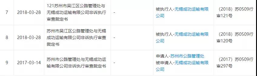 據(jù)公開信息顯示,從2017年至2019年近3年時間內(nèi),無錫成功運(yùn)輸有限公司至少涉及9起法律訴訟。案由涵蓋“機(jī)動車交通事故責(zé)任糾紛”“違反《公路安全保護(hù)條例》第六十四條”等。