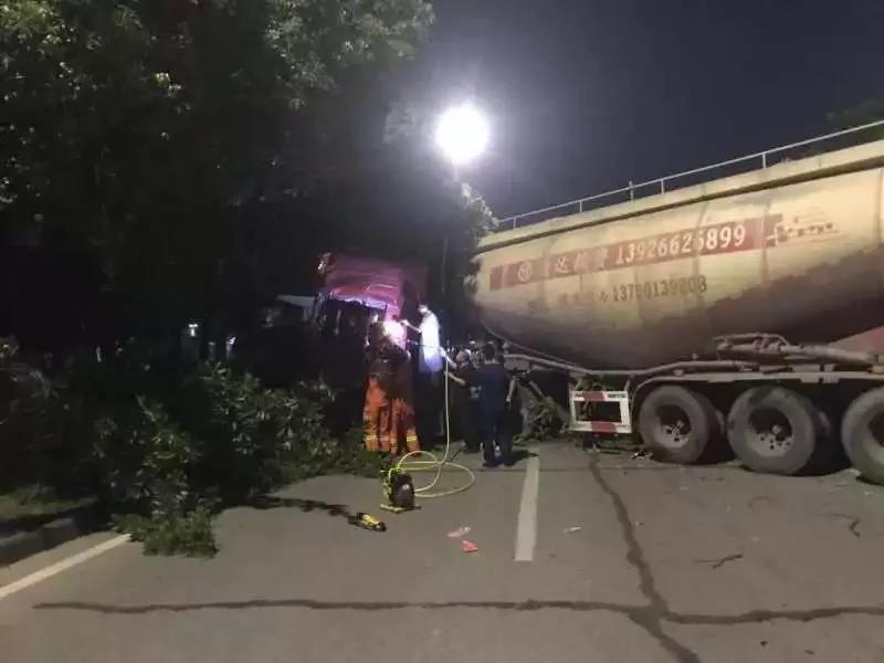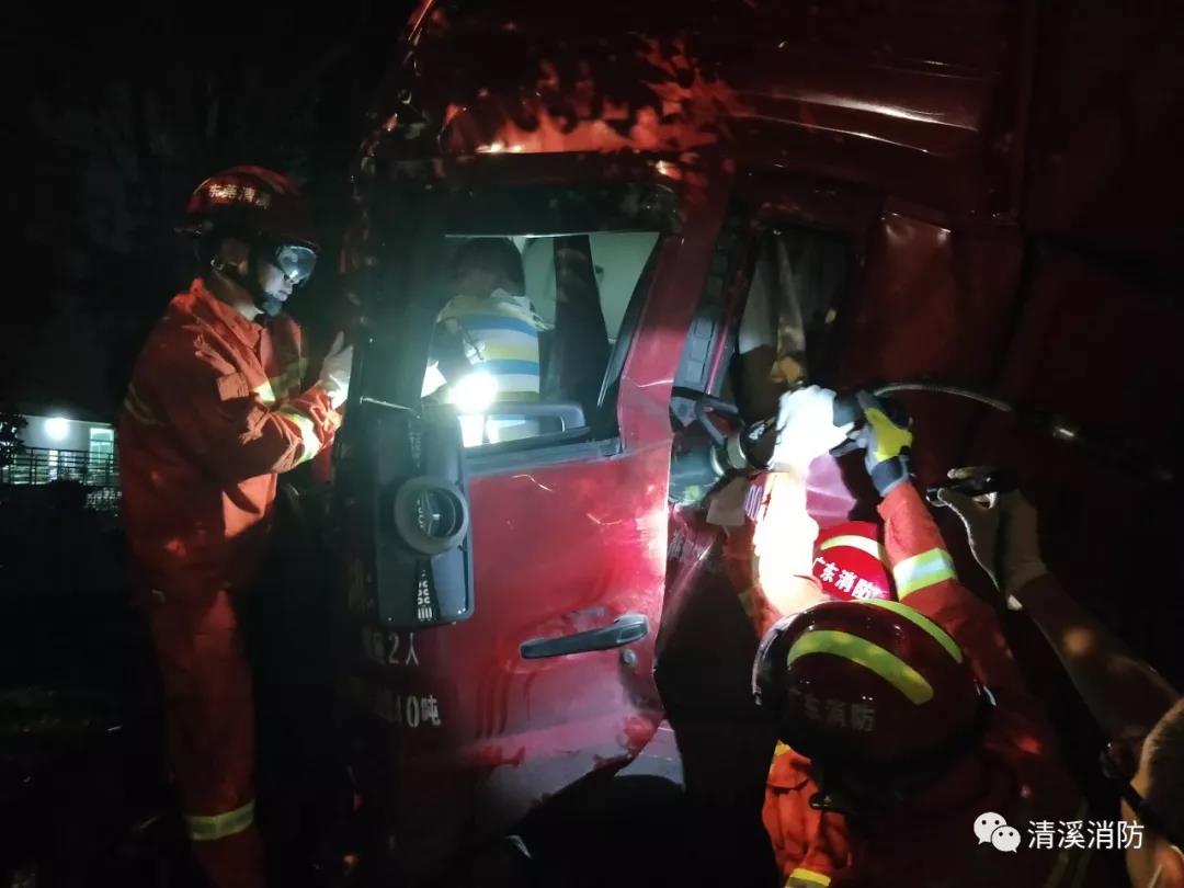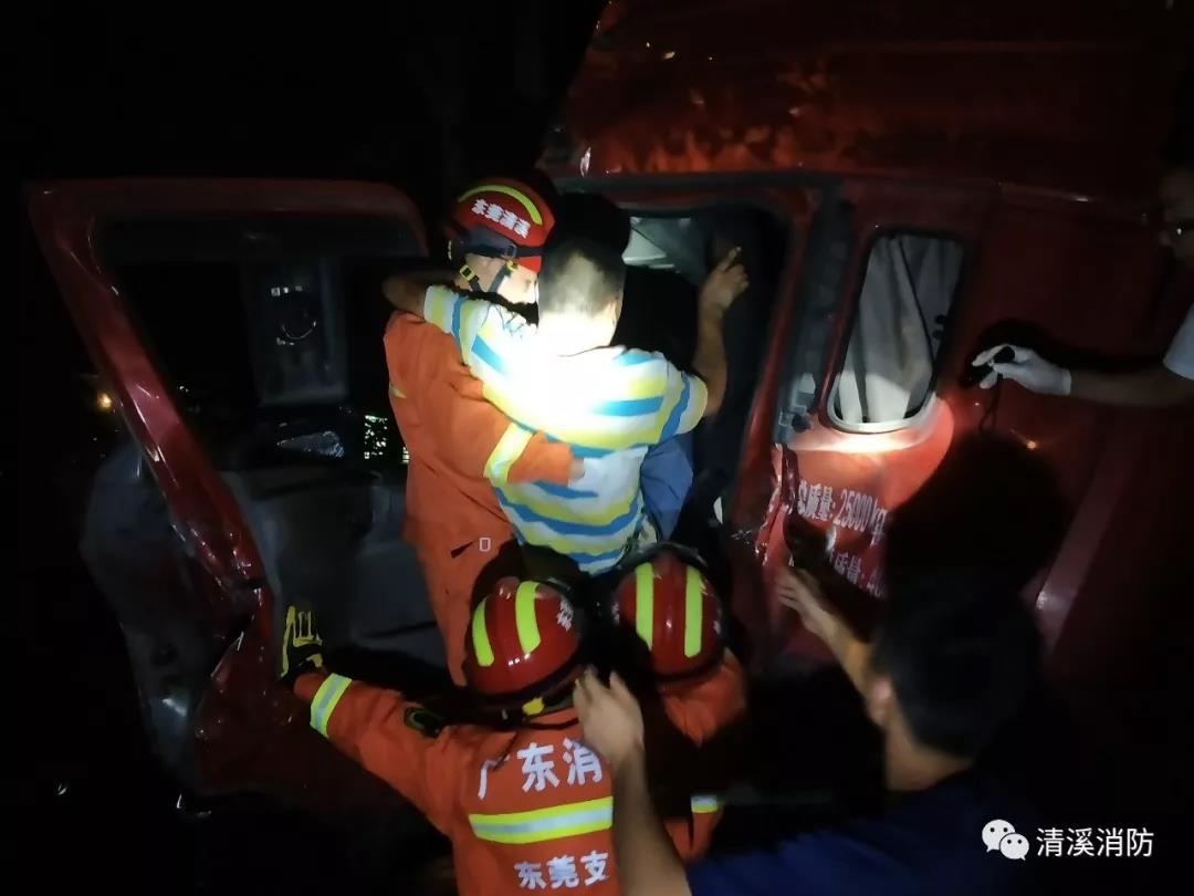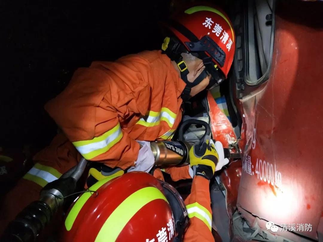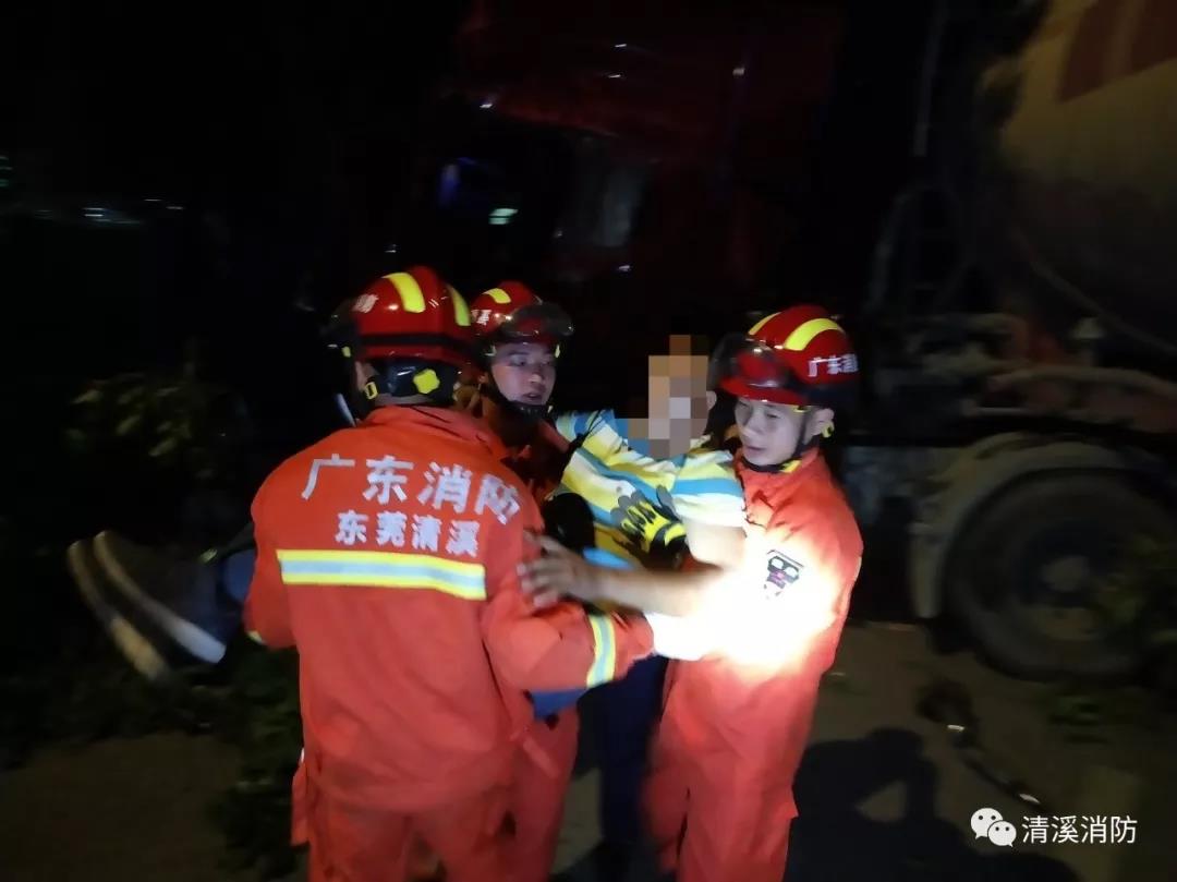 2019年10月15日晚11時41分許,廣東東莞市清溪長山頭水廠門口一輛水泥車與一輛大貨車發(fā)生碰撞,水泥車司機被困車內(nèi)情況緊急。