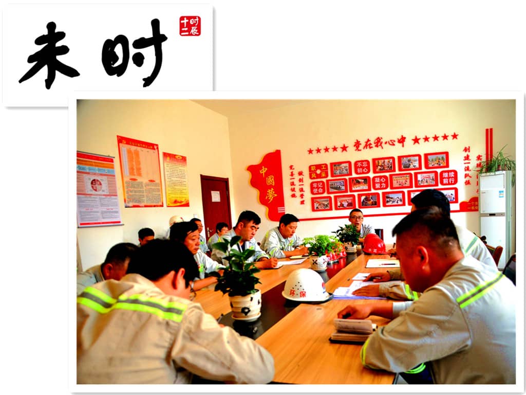 未時(shí)(13:00—15:00)“未時(shí)紅日過(guò)街來(lái)”。生產(chǎn)設(shè)備部正在召開(kāi)臨時(shí)會(huì)議,齊心協(xié)力商討2#水泥磨的檢修計(jì)劃,及圍繞此計(jì)劃實(shí)施的安全生產(chǎn)細(xì)則。