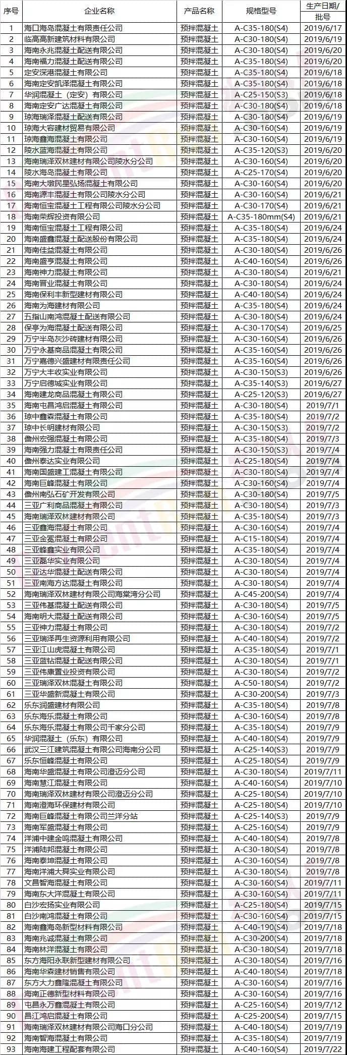 2019年海南省預(yù)拌混凝土產(chǎn)品質(zhì)量