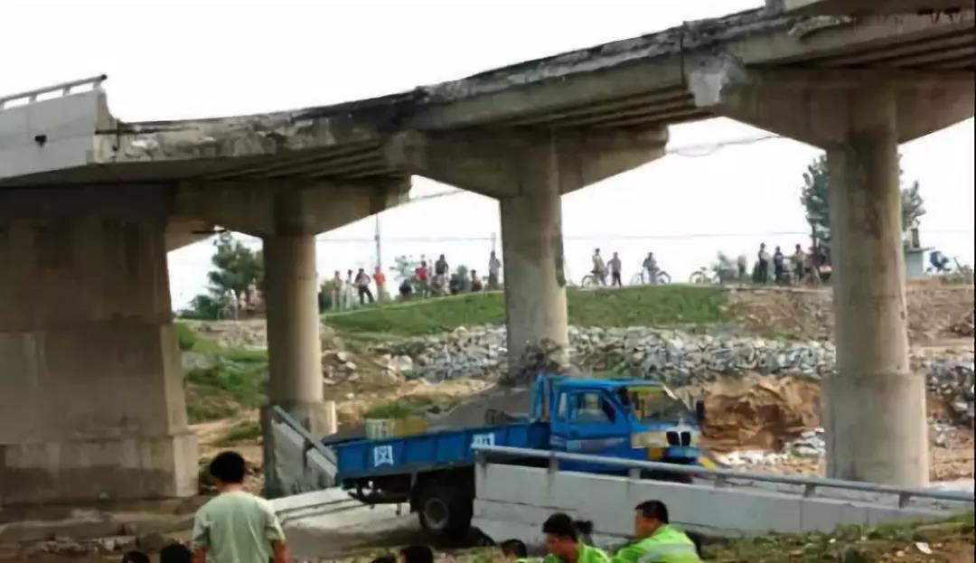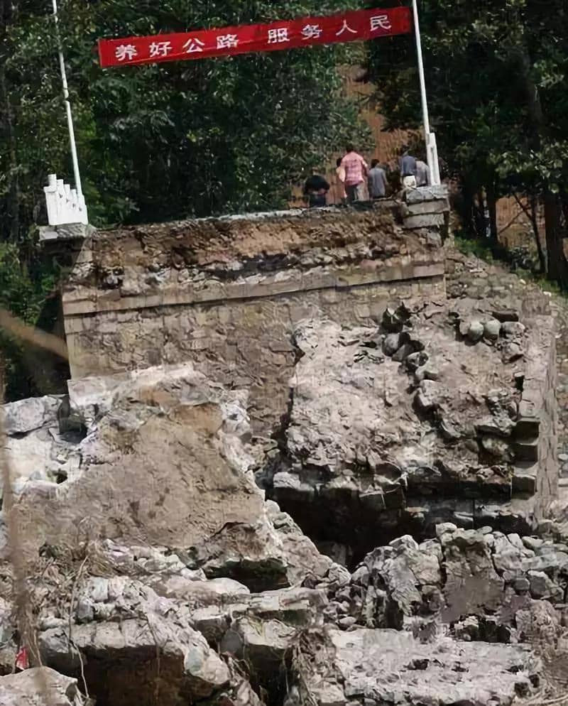 伊河湯營大橋整體垮塌。橋上掛的橫幅是何等諷刺啊?