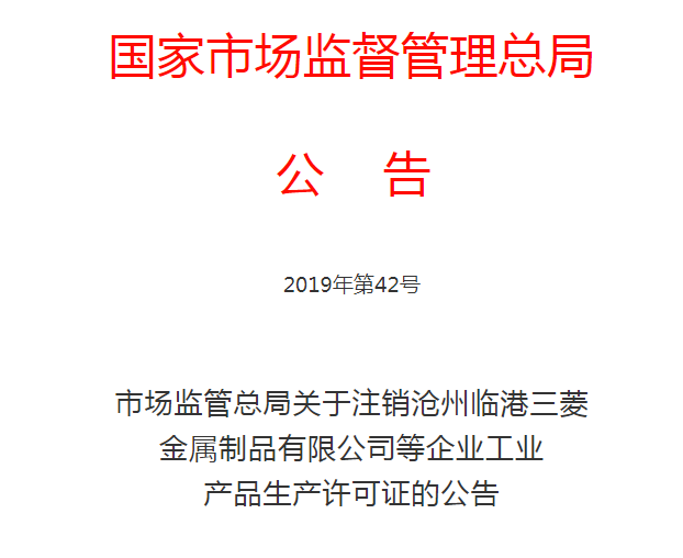 水泥人網(wǎng)消息:日前,國家市場監(jiān)管總局發(fā)布《關于注銷滄州臨港三菱金屬制品有限公司等企業(yè)工業(yè)產(chǎn)品生產(chǎn)許可證的公告》稱:根據(jù)《中華人民共和國工業(yè)產(chǎn)品生產(chǎn)許可證管理條例》(國務院令第440號)、《中華人民共和國工業(yè)產(chǎn)品生產(chǎn)許可證管理條例實施辦法》(質檢總局令第156號),因生產(chǎn)許可證有效期屆滿未延續(xù)等情形,決定注銷滄州臨港三菱金屬制品有限公司等603家企業(yè)的工業(yè)產(chǎn)品生產(chǎn)許可證,并將名單予以公布。