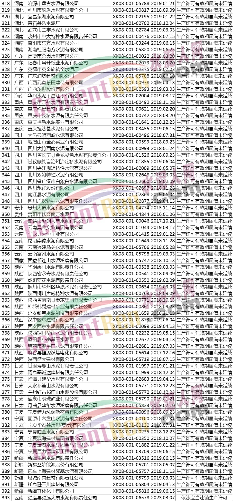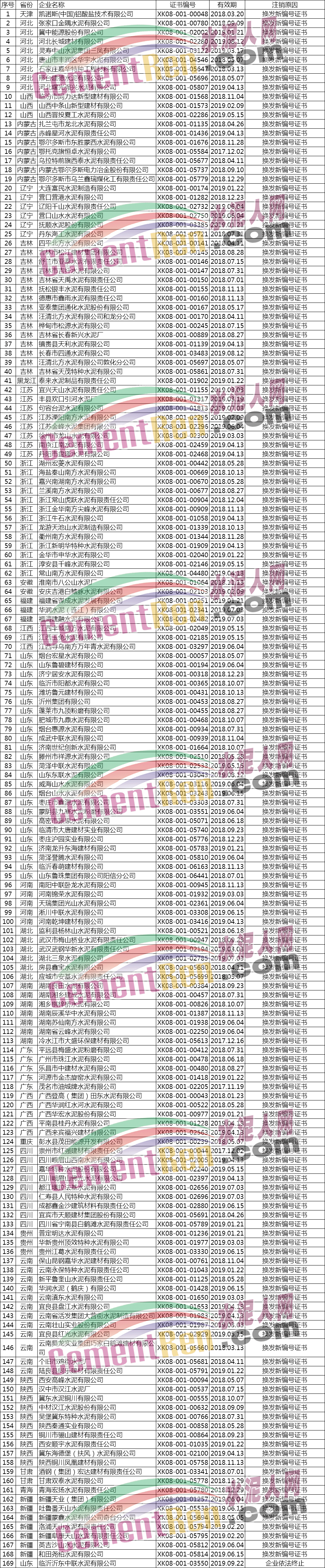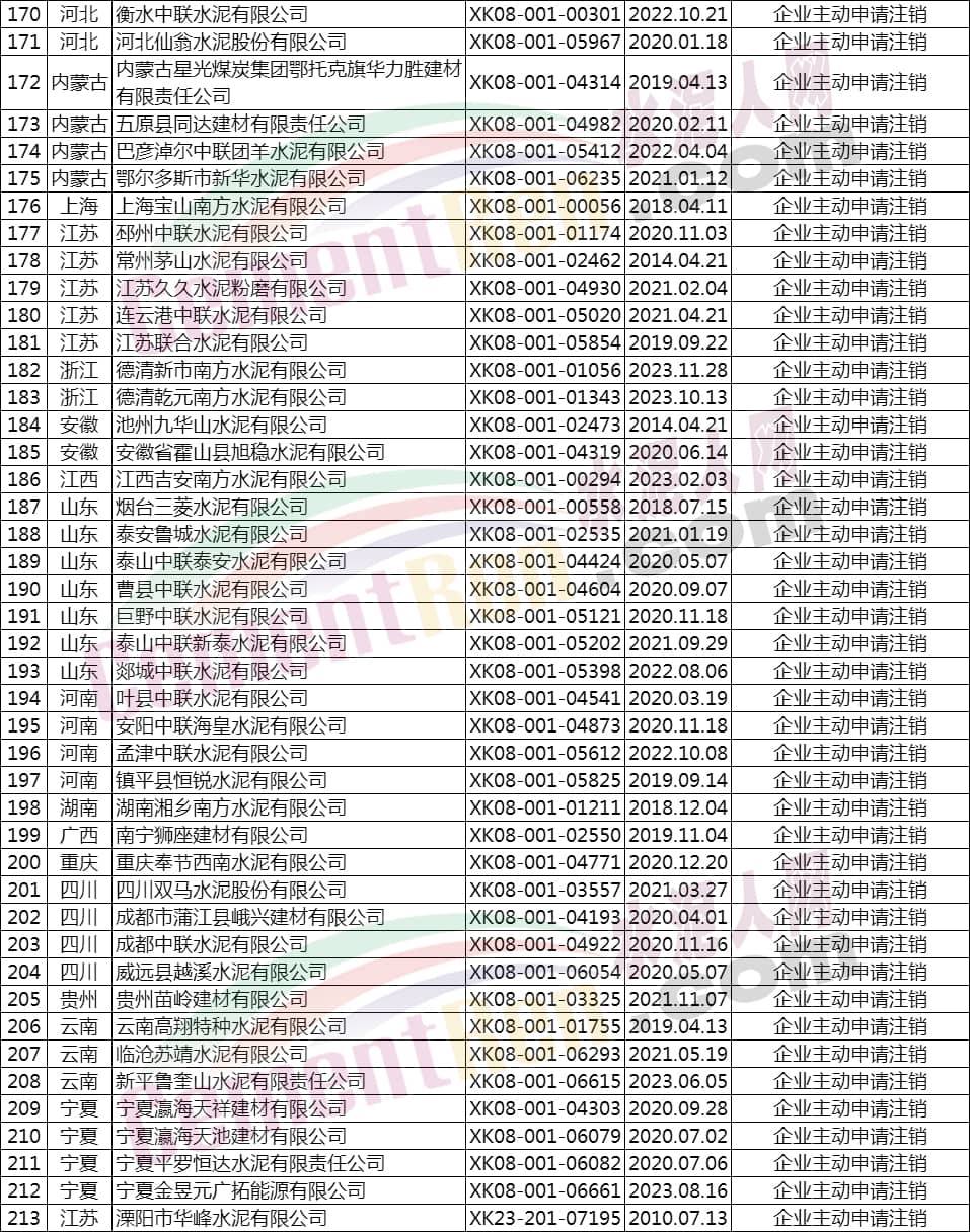 據(jù)水泥人網(wǎng)了解,公告注銷工業(yè)產(chǎn)品生產(chǎn)許可證的603家企業(yè)中包括393家水泥企業(yè)。其注銷原因為,換發(fā)新編號證書、企業(yè)主動申請注銷、生產(chǎn)許可有效期屆滿未延續(xù)等,詳情如下: