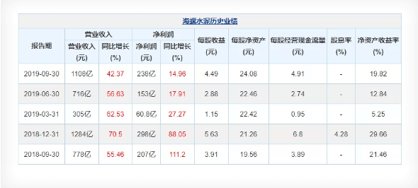 水泥人網(wǎng)消息:海螺水泥10月23日最新公布的2019年三季報(bào)顯示,前三季度營(yíng)業(yè)收入1108億元,同比增長(zhǎng)42.37%;歸屬于上市公司股東的凈利潤(rùn)238億元,同比增長(zhǎng)14.96%?;久抗墒找?.49元。