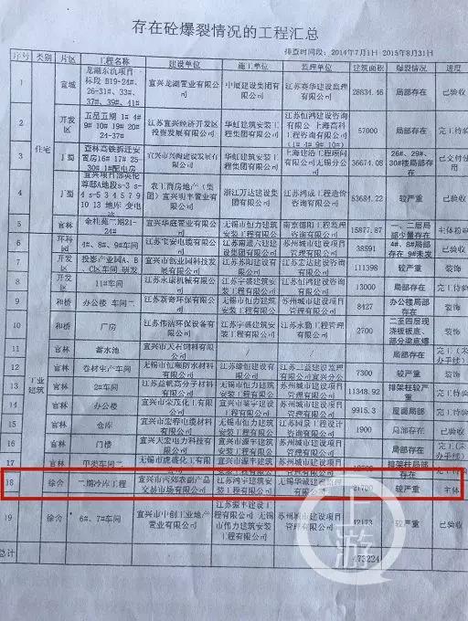 記者獲取的一份由當?shù)厥┕ぶ鞴懿块T出具的《存在砼爆裂情況的工程匯總》表顯示,同期使用宜興市三木建材有限公司混凝土導致項目出現(xiàn)質(zhì)量問題的工程共有19處,建筑面積達473224平方米。其中爆裂情況較嚴重的項目共有4個,西郊農(nóng)副產(chǎn)品交易市場就是其中之一。