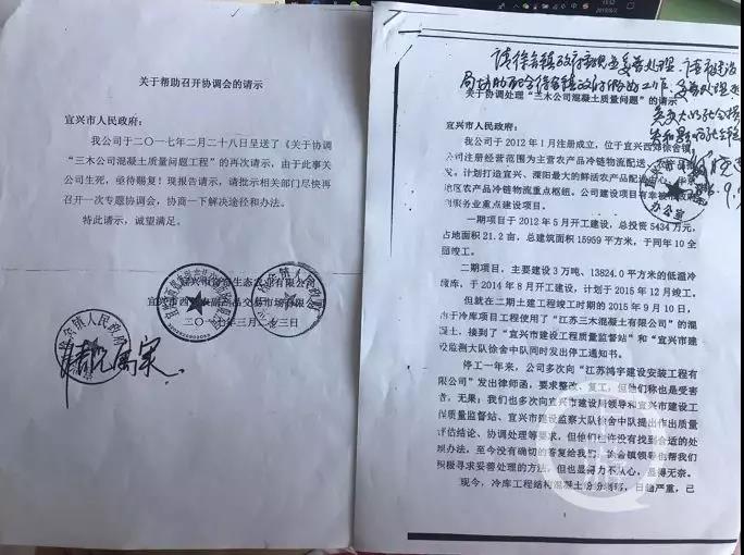 4年里,周順奇一次又一次向宜興市委市政府、宜興市住建局反映,尋找鑒定和處理結果,但收效甚微,期間隨著爆點的增多,原本的冷庫也已經(jīng)成為危樓。 據(jù)周順奇提供的自2016年至2017年多份政府批文顯示,宜興市人民政府曾多次要求宜興市住建局配合徐舍鎮(zhèn)妥善處理好西郊農(nóng)副產(chǎn)品交易市場因混凝土質(zhì)量問題停工問題。但周順奇稱:“住建部門多次要求我們做鑒定,交了大筆的鑒定費后,只是說混凝土存在不穩(wěn)定因素,但并沒有說明該建筑是否應當被拆除或可以改為他用,也沒有說明混凝土企業(yè)是否應承擔相應責任。”由江蘇省東南建設工程安全鑒定有限公司出具的兩份鑒定報告也證實了周順奇的說法。事故發(fā)生后,宜興市住建局始終未追究宜興市三木建材有限公司“生產(chǎn)銷售假冒偽劣產(chǎn)品”的責任。2017年8月,周順奇將宜興市人民政府、宜興市住建局告上法庭。請求無錫市中級人民法院依法認定宜興市人民政府、宜興市住建局對造成建設工程特大質(zhì)量事故的處置嚴重失控,屬行政不作為;同時判令兩部門及時按照國務院關于《生產(chǎn)安全事故報告和調(diào)查處理條例》嚴格執(zhí)行。“混凝土生產(chǎn)企業(yè)需要由經(jīng)信委的立項,住建局的審批和環(huán)保局的環(huán)評報告,而且還要辦理銷售許可證,而我了解到宜興市三木建材有限公司的證件并不齊全。”周順奇說。據(jù)2018年1月16日無錫市中級人民法院庭審筆錄顯示,庭審中,對于周順奇的訴求請求,宜興市人民政府、宜興市住建局稱其均嚴格按照相關法律規(guī)章的規(guī)定,依法履行了各項職責,并不存在違法情形。同時,宜興市住建局表示,目前事故原因和事故經(jīng)過已很清楚,但造成的損失無法確認。后經(jīng)法院協(xié)調(diào),2019年1月18日,宜興市人民政府向無錫市中級人民法院送達了協(xié)調(diào)函。關于周順奇一案,目前宜興市人民政府正在積極協(xié)調(diào)處理此事,要求暫停審限。