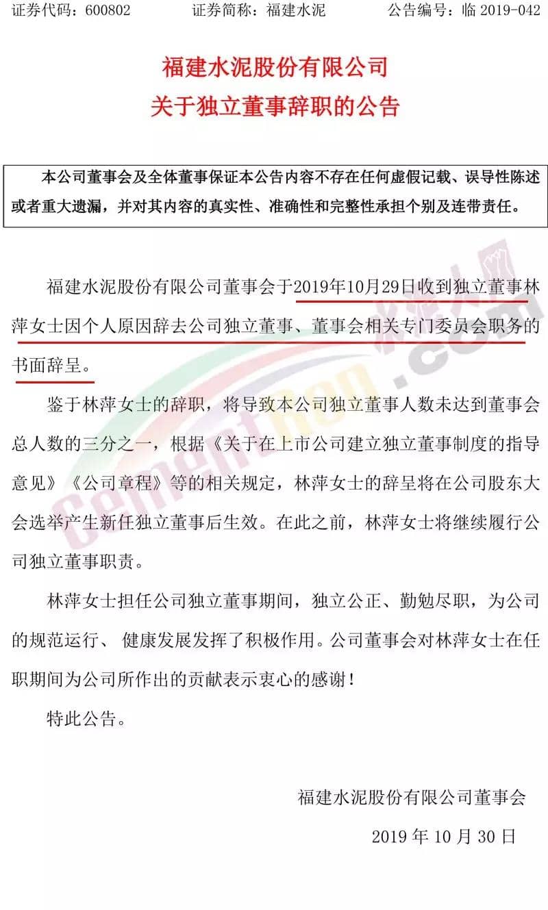 福建水泥:10月29日,福建水泥股份有限公司(600802)董事會于2019年10月29日收到獨立董事林萍因個人原因辭去公司獨立董事、董事會相關(guān)專門委員會職務(wù)的書面辭呈。林萍自2016年8月12日任獨立董事,最新一期披露的年薪為4萬元。其任職期間公司股價下跌11.2%,當(dāng)日股價下跌4.04%。林萍任職期間,福建水泥市值從31.65億元跌至28.14億元,市值縮水了3.51億元。最新財報顯示,福建水泥股份有限公司2019年第三季度營業(yè)總收入為19.75億,同比下滑1.04%;歸屬凈利潤為2.58億,同比下滑19.91%。福建水泥股份有限公司始創(chuàng)于1958年,具有五十多年的歷史,為福建省傳統(tǒng)企業(yè),公司主要從事水泥及熟料的生產(chǎn)及銷售,是福建地區(qū)產(chǎn)能規(guī)模具大的水泥制造企業(yè),生產(chǎn)的產(chǎn)品主要有“建福”和“煉石”兩個品牌的各等級硅酸鹽水泥,通過公路、鐵路運輸渠道,將產(chǎn)品送往福建省各區(qū)域市場。根據(jù)上市企業(yè)數(shù)據(jù)庫信息顯示:林萍,教授。畢業(yè)于華東理工大學(xué)硅酸鹽工程專業(yè),本科學(xué)歷,獲廈門大學(xué)工商管理碩士學(xué)位和企業(yè)管理博士學(xué)位。現(xiàn)任閩江學(xué)院教授,碩士生導(dǎo)師,兼任全球中小企業(yè)創(chuàng)業(yè)聯(lián)合會副秘書長,科技部國家專家?guī)鞂<?。曾任閩江學(xué)院副教授,美國哥倫比亞大學(xué)訪問學(xué)者。擅長企業(yè)管理的咨詢,主持十幾項省廳級課題,在核心刊物發(fā)表論文二十幾篇。公告原文如下: