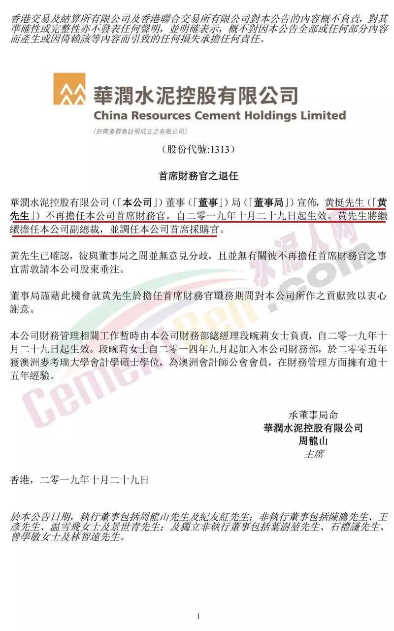 華潤水泥控股華潤水泥控股(01313)發(fā)布公告,黃挺不再擔(dān)任公司首席財務(wù)官,自2019年10月29日起生效。黃挺將繼續(xù)擔(dān)任公司副總裁,并調(diào)任公司首席采購官。公司財務(wù)管理相關(guān)工作暫時由公司財務(wù)部總經(jīng)理段畹莉負(fù)責(zé),自2019年10月29日起生效。段畹莉自2014年9月起加入公司財務(wù)部,于2005年獲澳洲麥考瑞大學(xué)會計學(xué)碩士學(xué)位,為澳洲會計師公會會員,在財務(wù)管理方面擁有逾15年經(jīng)驗。公告原文如下: