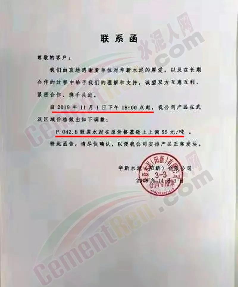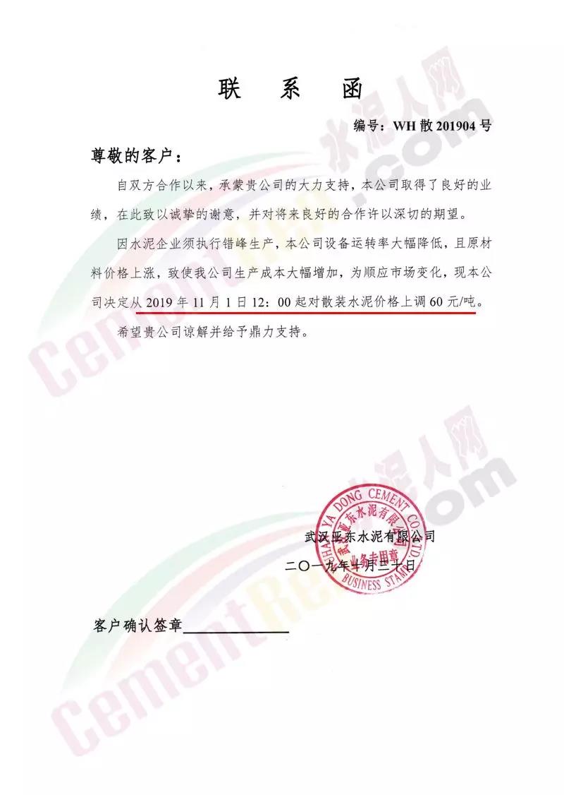 日前,湖北區(qū)域主導(dǎo)企業(yè)華新水泥、亞?wèn)|水泥等發(fā)布調(diào)價(jià)通知稱上調(diào)水泥價(jià)格,最高漲60元/噸。其中亞?wèn)|水泥調(diào)價(jià)通知稱,因水泥企業(yè)執(zhí)行錯(cuò)峰生產(chǎn),公司設(shè)備運(yùn)轉(zhuǎn)率大幅降低,且原材料價(jià)格上漲,致使公司生產(chǎn)成本大幅增加,為順應(yīng)市場(chǎng)變化 ,決定 自11月1日12時(shí)起對(duì)散裝水泥上調(diào)60元/噸,包裝水泥上調(diào)50元/噸。調(diào)價(jià)通知如下: