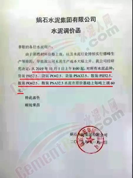 媧石水泥自11月1日上午8時(shí)起,水泥價(jià)格上調(diào)60元/噸