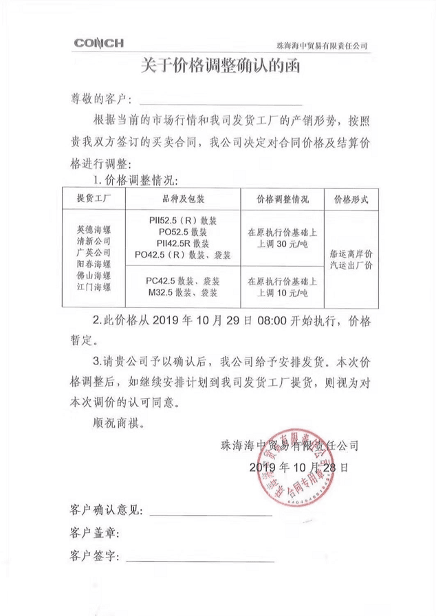日前,珠海海中貿(mào)易有限責(zé)任公司關(guān)于價格調(diào)整確認的函稱:根據(jù)當(dāng)前的市場行情和公司發(fā)貨工廠的產(chǎn)銷形勢,公司決定對合同價格及結(jié)算價格進行調(diào)整,新價格從10月29日8點開始執(zhí)行。