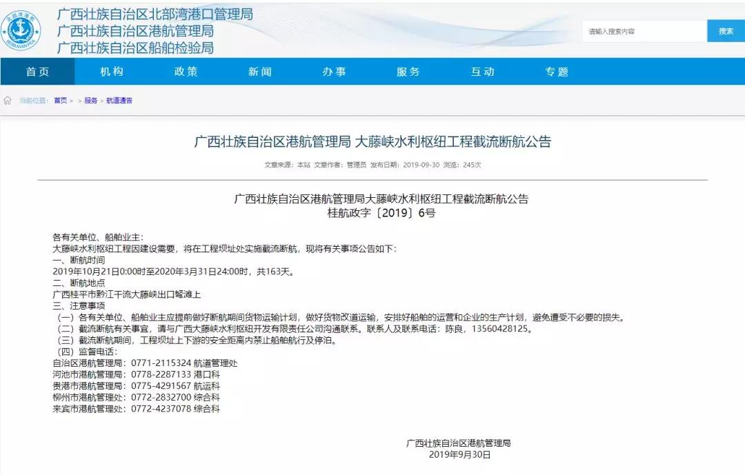 然而,據(jù)水泥人網(wǎng)了解,除了近期發(fā)布的航道清淤工程之外,廣西壯族自治區(qū)港航管理局、梧州市西江黃金水道通航突發(fā)事件應急指揮部、廣西壯族自治區(qū)北部灣港口管理局、交通運輸部長江航務管理局也曾分別發(fā)文,對各區(qū)域內(nèi)的大壩進行檢修或者進行限流。大藤峽水利樞紐斷航163天!江門、中山等地水泥、砂石價格上漲!廣西壯族自治區(qū)港航管理局發(fā)布《大藤峽水利樞紐工程截流斷航公告》稱:因大藤峽水利樞紐工程建設需要,將于2019年10月21日0:00時至2020年3月31日24:00時(共163天)在廣西桂平市黔江干流大藤峽出口弩灘工程壩址處實施截流斷航。截流斷航期間,工程壩址上下游的安全距離內(nèi)禁止船舶航行及停泊。斷航公告提示各有關單位、船舶業(yè)主提前做好斷航期間貨物運輸計劃,做好貨物改道運輸,安排好船舶的運營和企業(yè)的生產(chǎn)計劃,避免遭受不必要的損失。