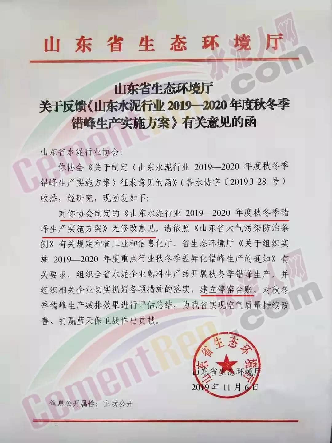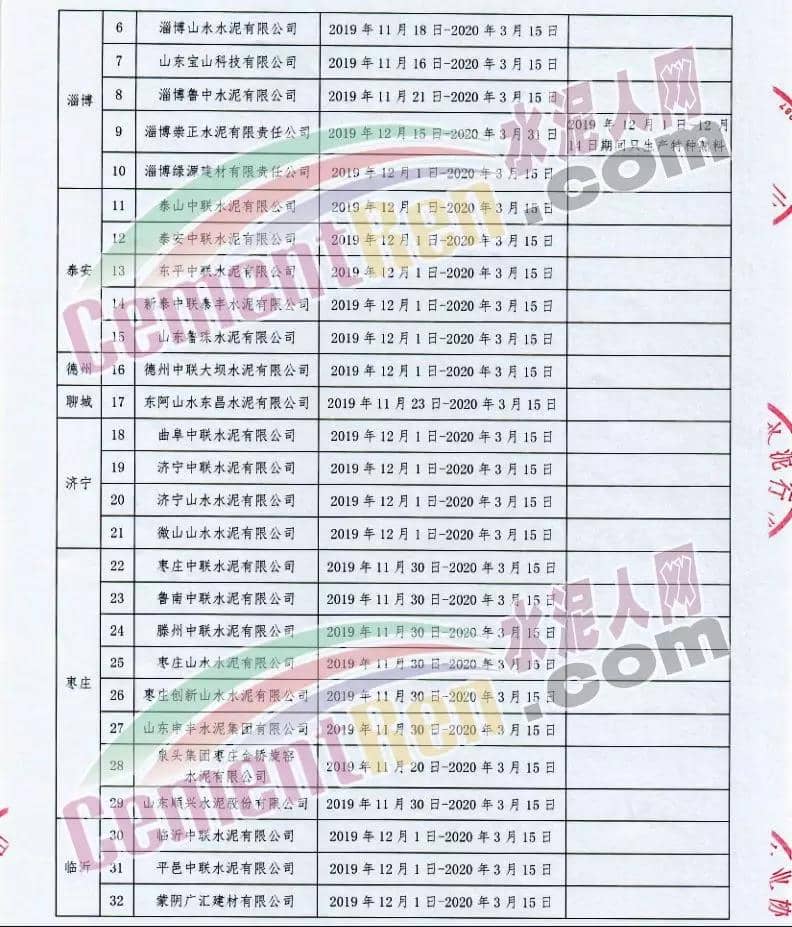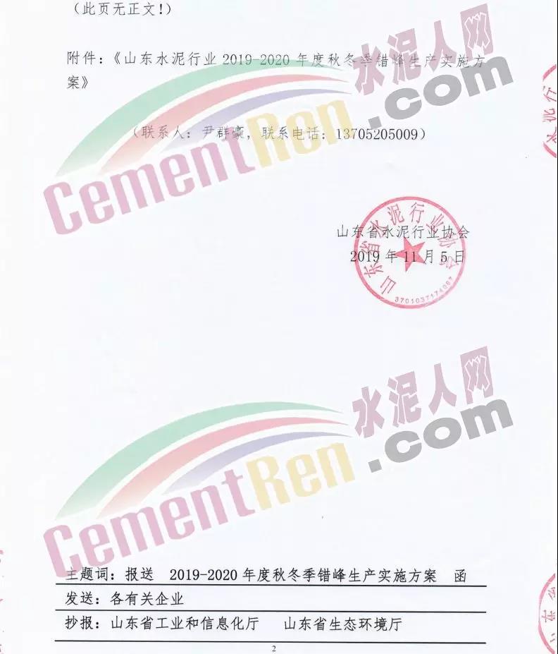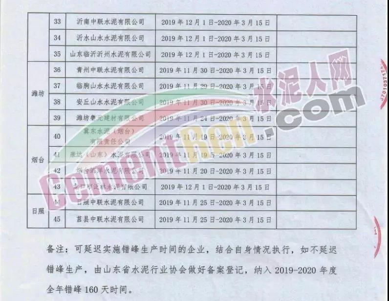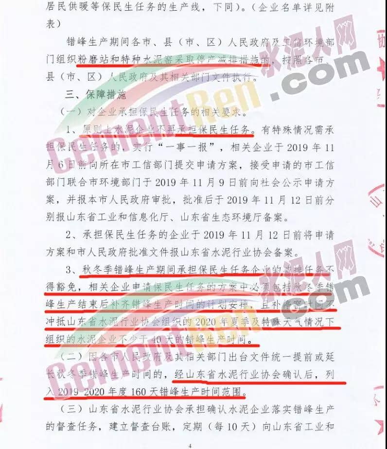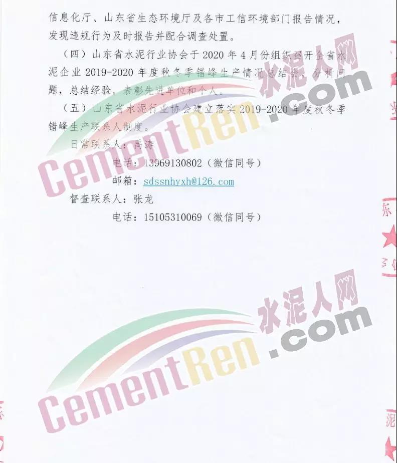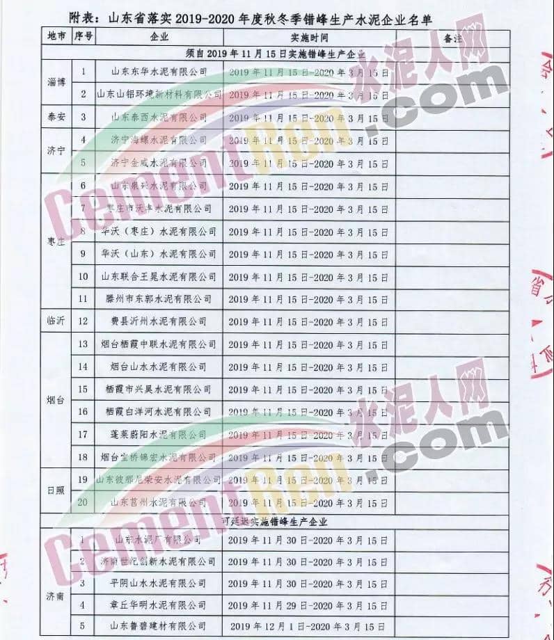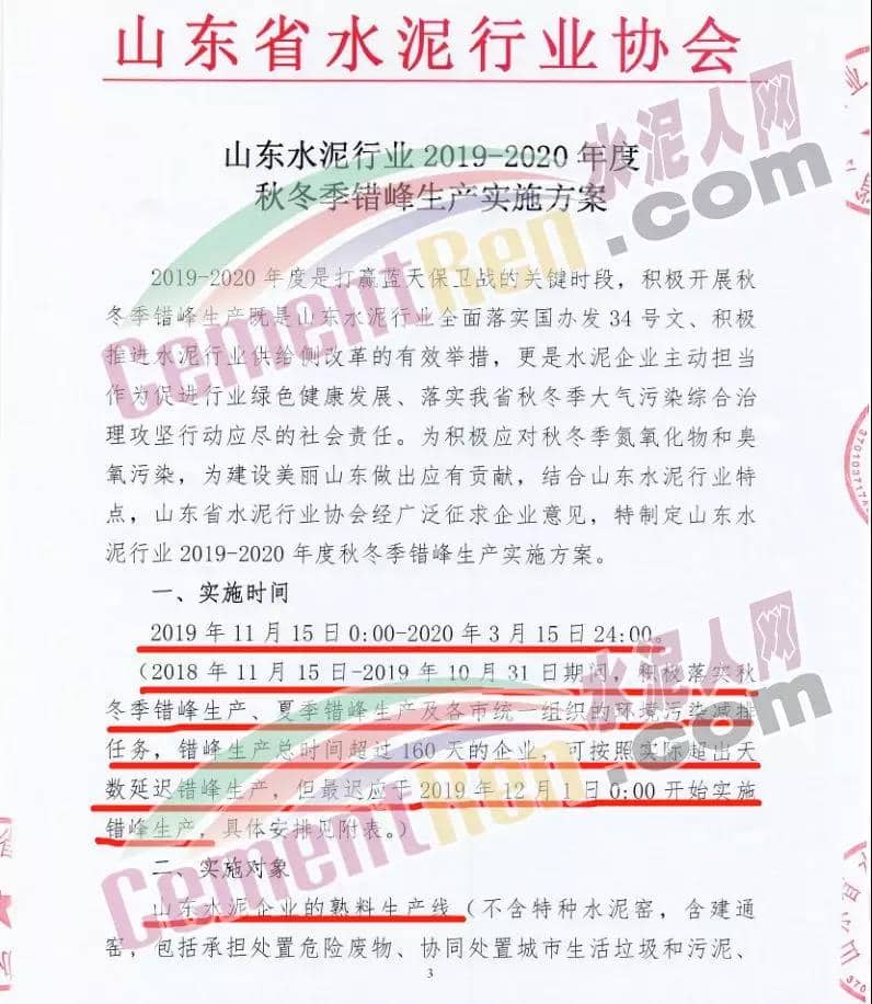 一、實施時間: 2019年11月15日0時-2020年3月15日24時。(2018年11月15日-2019年10月31日期間,積極落實秋冬季錯峰生產(chǎn)、夏季錯峰生及各市統(tǒng)一組織的環(huán)境污染減排任務(wù),錯峰生產(chǎn)總時間超過160天的企業(yè),可按照實際超出天數(shù)延遲錯峰生產(chǎn),但最遲應(yīng)于2019年12月1日0時開始實施錯峰生產(chǎn),具體安排見附表。)二、實施對象: 山東水泥企業(yè)的熟料生產(chǎn)線(不含特種水泥窯,含建通窯,包括承擔(dān)處置危險廢物、協(xié)同處置城市生活垃圾和污泥、居民供暖等保民生任務(wù)的生產(chǎn)線,下同)。(企業(yè)名單見附表); 錯峰生產(chǎn)期間各市、縣(市、區(qū))人民政府及工信環(huán)境部門組織粉磨站和特種水泥窯采取停產(chǎn)減排措施的,按照各市、縣(市、區(qū))人民政府及相關(guān)部門文件執(zhí)行。三、保障措施 1、原則上水泥企業(yè)不再承擔(dān)保民生任務(wù)。有特殊情況需承擔(dān)民生任務(wù)的,實行“一事一報”,相關(guān)企業(yè)于2019年11月6日前向所在市工信部門提交申請方案,接受申請的市工信部門聯(lián)合市環(huán)境部門于2019年11月9日前向社會公示申請方案,并報本市人民政府審批,批準(zhǔn)后于2019年11月12日前分別報山東省工業(yè)和信息化廳、山東省生態(tài)環(huán)境廳備案。 2、承擔(dān)保民生任務(wù)的企業(yè)于2019年11月12日前將申請方案和市人民政府批準(zhǔn)文件報山東省水泥行業(yè)協(xié)會備案?! ?、秋冬季錯峰生產(chǎn)期間承擔(dān)保民生任務(wù)企業(yè)的減排任務(wù)不得豁免,相關(guān)企業(yè)申請保民生任務(wù)的方案中必須包括秋冬季錯峰生產(chǎn)結(jié)束后補齊錯峰生產(chǎn)時間的計劃安排,且補停窯時間不沖抵山東省水泥行業(yè)協(xié)會組織的2020年夏季及特殊天氣情況下組織的水泥企業(yè)不少于40天的錯峰生產(chǎn)時間。全文如下: