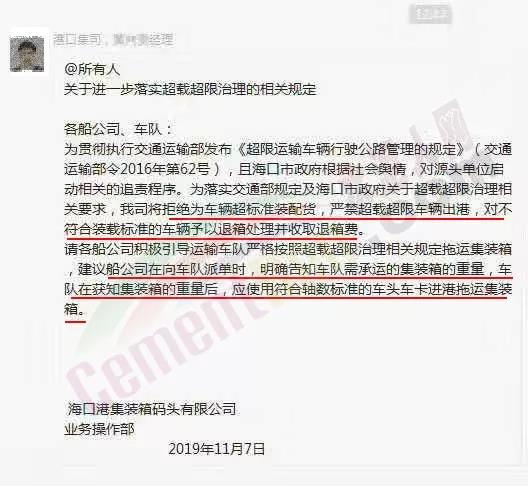 11月7日,海口港集裝箱碼頭有限公司業(yè)務(wù)操作部發(fā)布《關(guān)于進(jìn)一步落實(shí)超載超限治理的相關(guān)規(guī)定》通知稱,公司將拒絕為車輛超標(biāo)準(zhǔn)裝配貨,嚴(yán)禁超載超限車輛出港,對(duì)不符合裝載標(biāo)準(zhǔn)的車輛予以退箱處理并收取退箱費(fèi)。同時(shí),建議船公司向車隊(duì)派單時(shí),明確告知車隊(duì)需承運(yùn)的集裝箱的重要,車隊(duì)在獲知集裝箱的重后,應(yīng)使用符合軸數(shù)標(biāo)準(zhǔn)的車頭車卡進(jìn)港拖運(yùn)集裝箱。