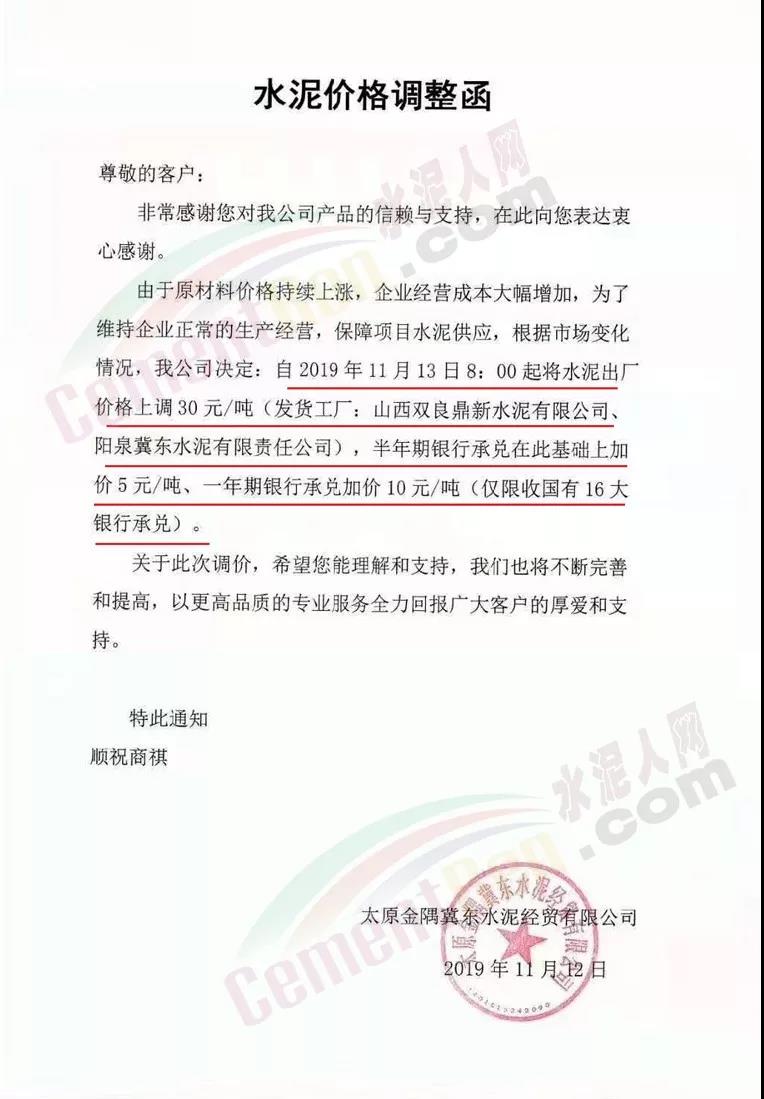 太原金隅冀東水泥調(diào)價(jià)通知稱:由于原材料價(jià)格上漲,企業(yè)經(jīng)營成本大幅增加,為了維持企業(yè)正常的生產(chǎn)經(jīng)營,保障項(xiàng)目水泥供應(yīng),根據(jù)市場(chǎng)變化情況,公司決定自11月13日早8時(shí)起將水泥出廠價(jià)格上調(diào)30元/噸。發(fā)貨工廠分別為山西雙良鼎新水泥有限公司、陽泉冀東水泥有限責(zé)任公司。