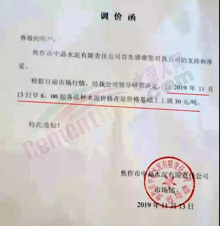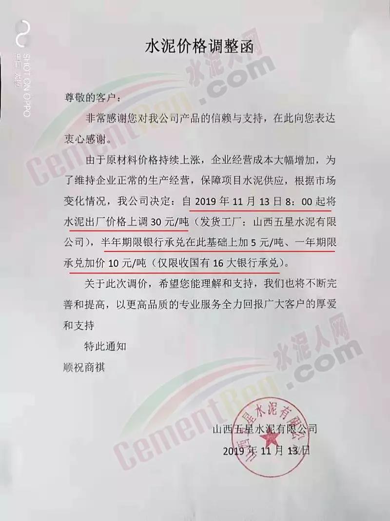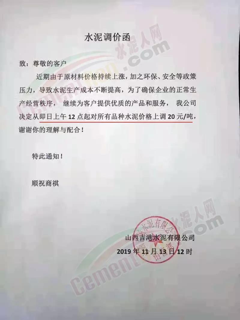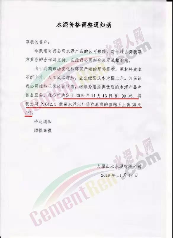 太原山水水泥有限公司水泥價(jià)格調(diào)整通知函稱,由于近期市場(chǎng)變化和環(huán)保嚴(yán)峻的形勢(shì)影響,原材料成本不斷上升、人工成本增加,企業(yè)經(jīng)營成本大升。為保證公司維持正常經(jīng)營狀態(tài),公司決定于11月13日8時(shí)起將公司P.O42.5散裝水泥出廠價(jià)在原有的基礎(chǔ)上上調(diào)30元/噸。