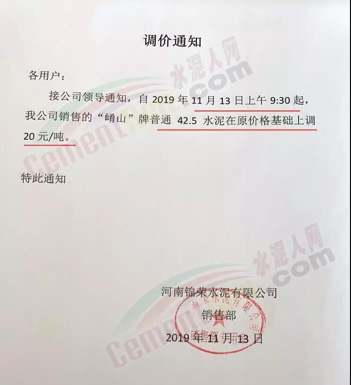 淄博魯晟建材有限公司通知自11月13日早8時(shí)起所有水泥出廠價(jià)格上調(diào)10元/噸。
