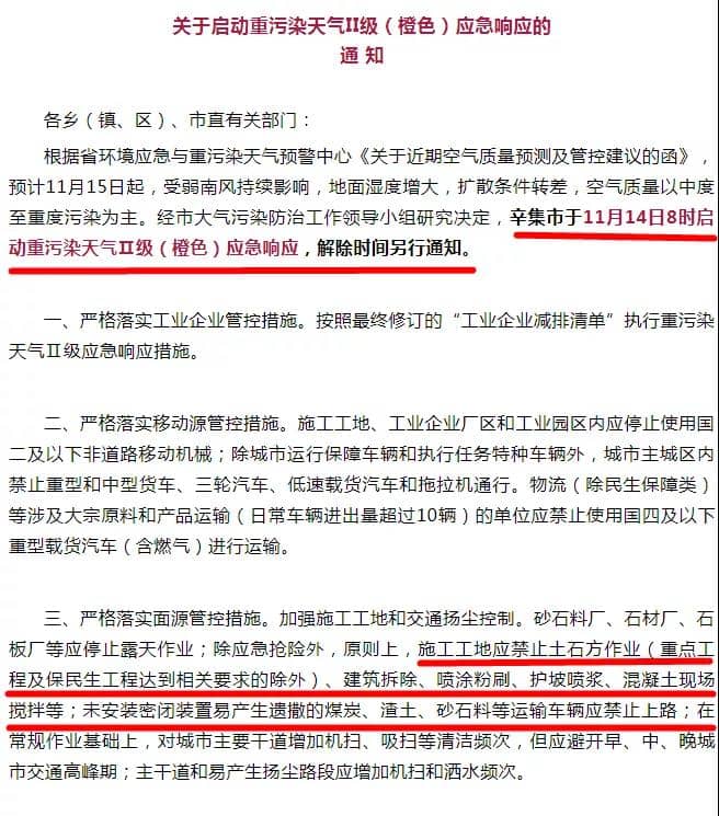 山東、河北、山西多省發(fā)布天氣橙色預(yù)警除此之外,山東濟(jì)南,河北邯鄲、衡水、辛集、石家莊、邢臺(tái),山西省高平、晉城、呂梁等地也陸續(xù)發(fā)布了重污染天氣橙色預(yù)警。據(jù)水泥人網(wǎng)了解,啟動(dòng)重污染天氣橙色預(yù)警之后,礦山、砂石料廠、石材廠、石板廠等應(yīng)停止露天作業(yè);除應(yīng)急搶險(xiǎn)外,施工工地應(yīng)禁止土石方作業(yè)、建筑拆除、噴涂粉刷、護(hù)坡噴漿、混凝土攪拌等;未安裝密閉裝置易產(chǎn)生遺撒的煤炭、渣土、砂石料等運(yùn)輸車(chē)輛應(yīng)禁止上路;在常規(guī)作業(yè)基礎(chǔ)上,對(duì)城市主要干道增加機(jī)掃、濕掃等清潔頻次,但應(yīng)避開(kāi)早、中、晚城市交通高峰期。據(jù)相關(guān)人士介紹,山東棗莊市委書(shū)記親自帶頭深入各企業(yè),嚴(yán)查各區(qū)域里企業(yè)、工地的停工停產(chǎn)情況。