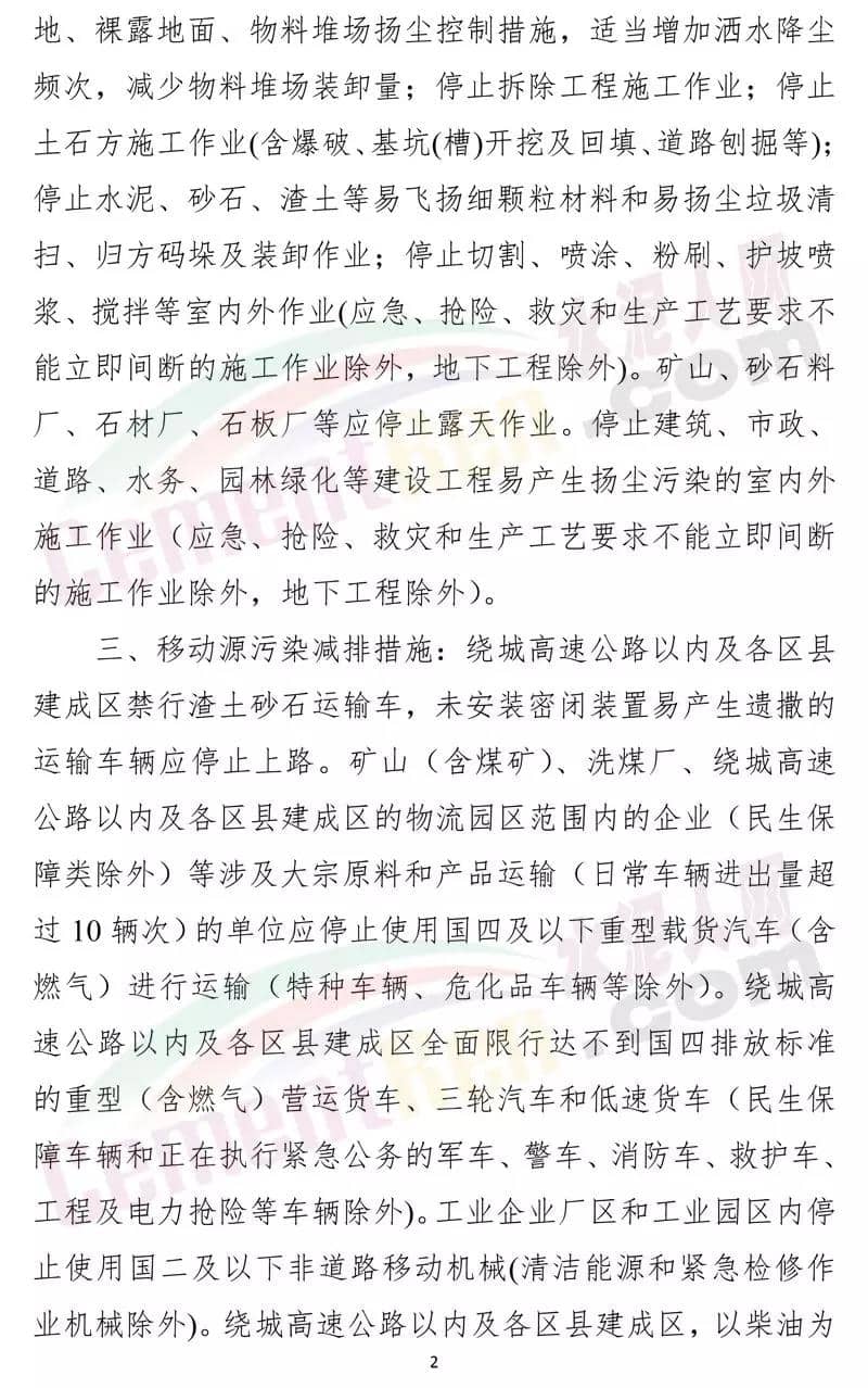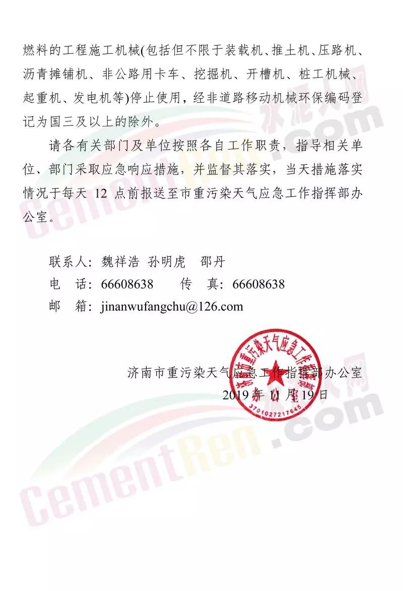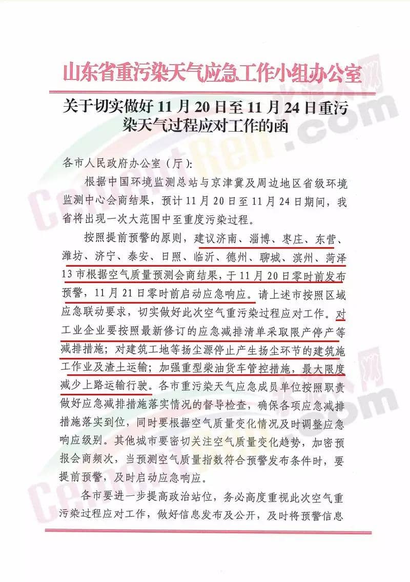 按照提前預(yù)警的原則,建議濟南、淄博 、棗莊、東營、維坊、濟寧、泰安、日照、臨沂、德州、聊城、濱州、荷澤13市根據(jù)空氣質(zhì)量預(yù)測會商結(jié)果,于11月20日零時前發(fā)布預(yù)警,11月21日零時前應(yīng)動應(yīng)急響應(yīng)。預(yù)警期間對工業(yè)企業(yè)要按照最新修訂的應(yīng)急減排清單采取限產(chǎn)停產(chǎn)等減排措施;對建筑 工地等揚塵源停止產(chǎn)能揚塵環(huán)節(jié)的建筑施工作業(yè)及渣土運輸;加強重型柴油貨車管控措施,最大限度減少上路運輸行駛等。工函原文如下: