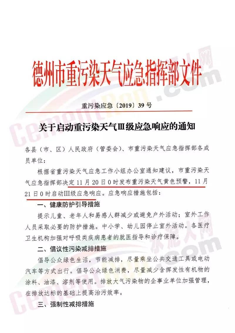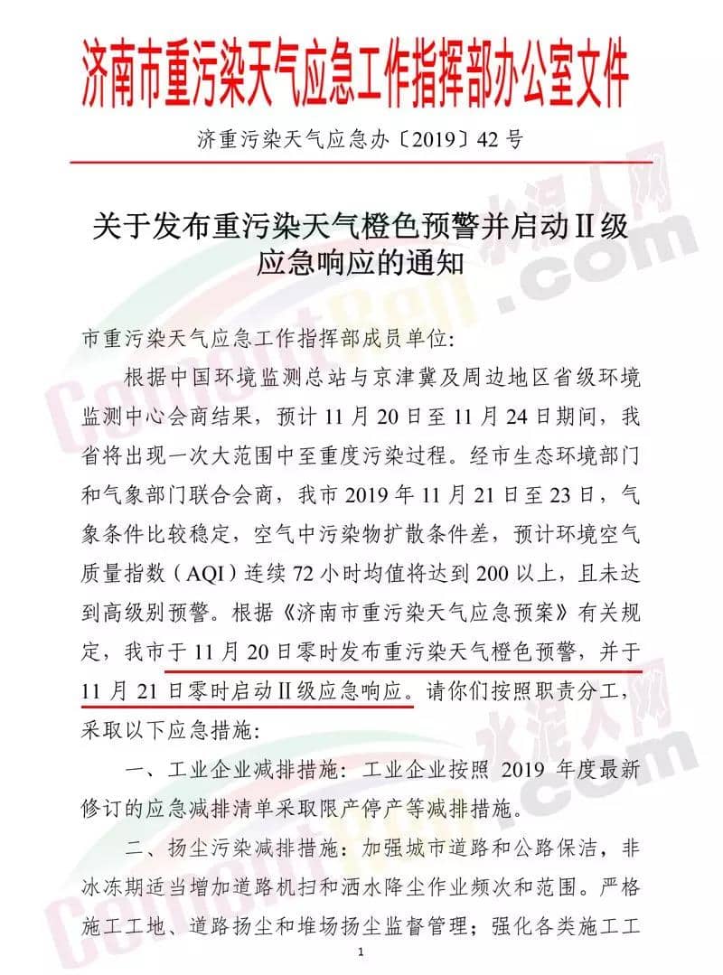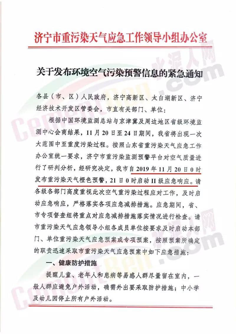 濟寧市重污染天氣應(yīng)急工作領(lǐng)導(dǎo)小組通知文件稱濟寧市自11月20日0時發(fā)布重污染天氣橙色預(yù)警。21日0時啟動II級應(yīng)急響應(yīng)。