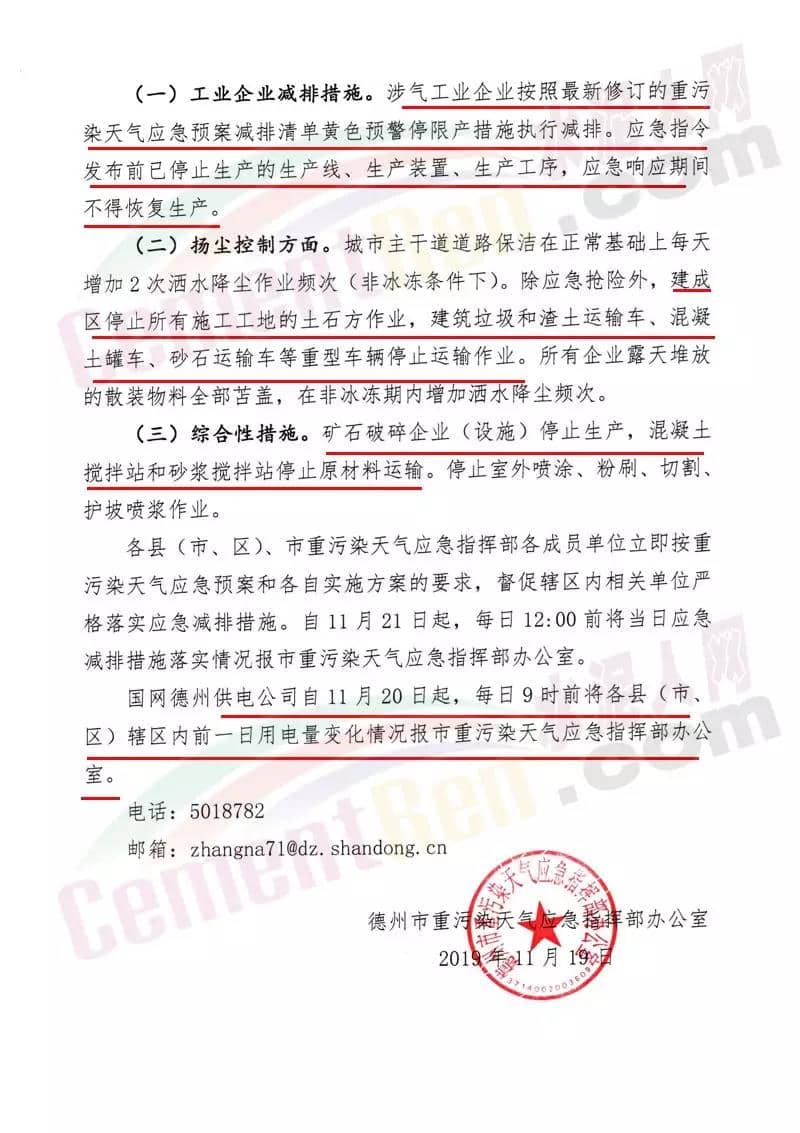 德州市重污染天氣應(yīng)急指按部發(fā)布通知文件稱,根據(jù)省重污染天氣應(yīng)急工作小組辦公室通知建議,德州市重污染天氣應(yīng)急指揮部決定 11月20日0時發(fā)布重污染天氣黃色預(yù)警,11月21日0時啟動III級應(yīng)急響應(yīng)。應(yīng)急呼應(yīng)措施包括:工業(yè)企業(yè)減排措施,涉氣工業(yè)企業(yè)按照最新修訂的重污染天氣應(yīng)急預(yù)案 減排清單黃色預(yù)警停限產(chǎn)措施執(zhí)行減排 。應(yīng)急指令發(fā)布前已停止生產(chǎn)的生產(chǎn)線、生產(chǎn)裝置、生產(chǎn)工序,應(yīng)急響應(yīng)期間不得恢復(fù)生產(chǎn)。揚塵控制方面,建成區(qū)停止所有施工工地的土石方作業(yè),建筑垃圾和渣土運輸 車、混凝土罐車、砂石運輸車等重型車輛停止運輸作業(yè)。礦石破碎企業(yè)(設(shè)施)停止生產(chǎn),混凝土攪拌站和砂漿攪拌站停止原材料運輸 。國網(wǎng)供電公司自11月20日起,每日9時前將各縣 (市、區(qū))轄區(qū)內(nèi)前一日用電量變化情況報重污染天氣應(yīng)急指揮部辦公室。通知原文如下: