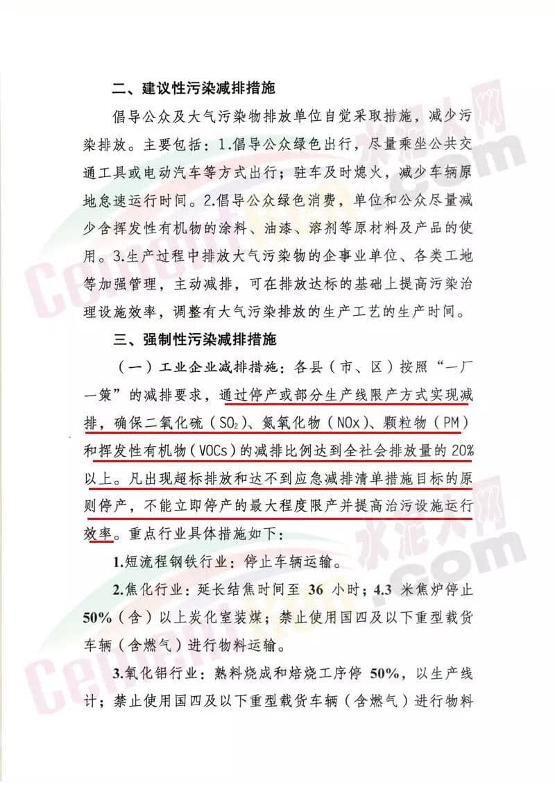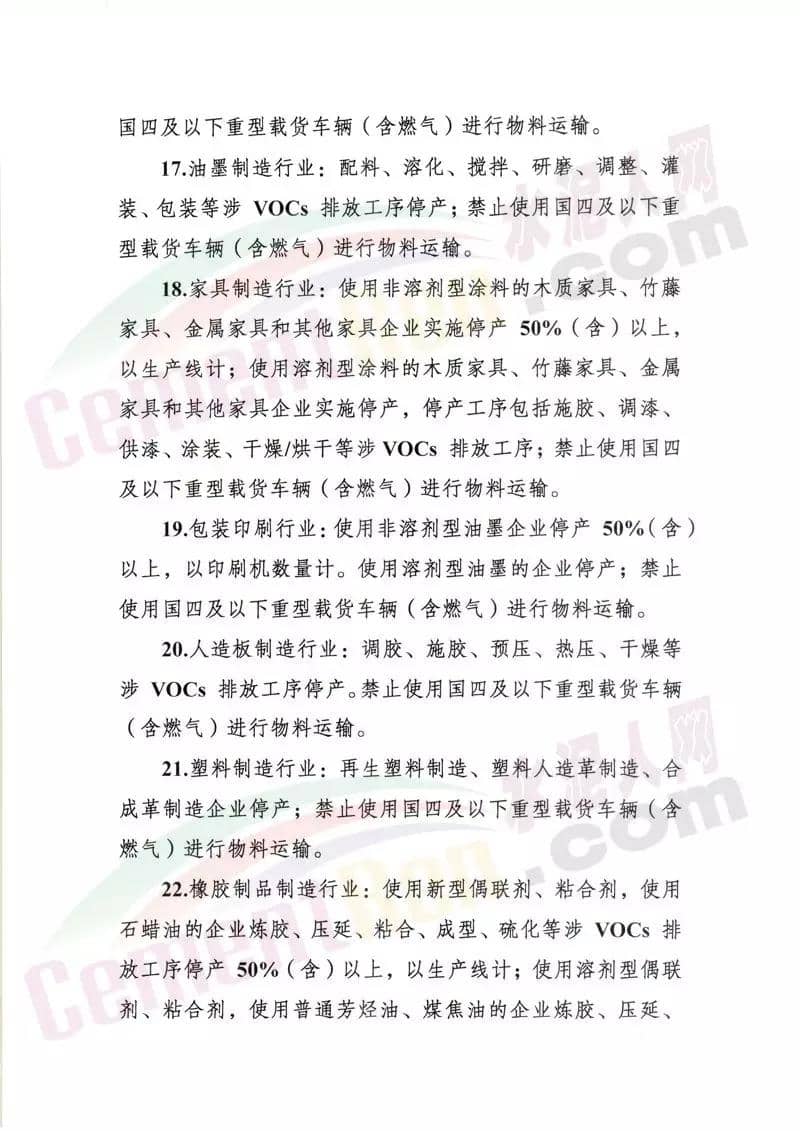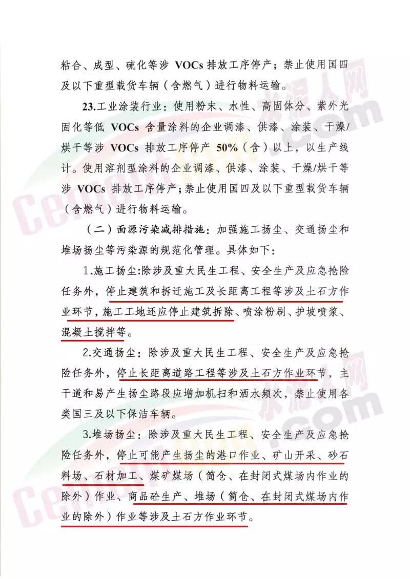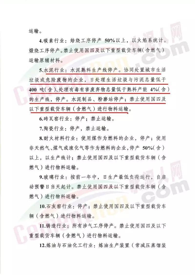 水泥行業(yè),水泥熟料生產(chǎn)線停產(chǎn)。協(xié)同處置城市生活垃圾或危險廢物的企業(yè),日處理生活垃圾與污染總量低于400噸(含)、處理有毒有害廢棄物總量低于熟料產(chǎn)能4%(含)的生產(chǎn)線,停產(chǎn)。水泥制品、粉磨站停產(chǎn);禁止使用國四及以下重型載貨車輛(含燃氣)進行物料運輸。
