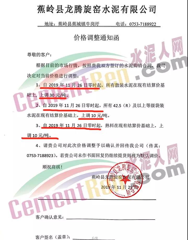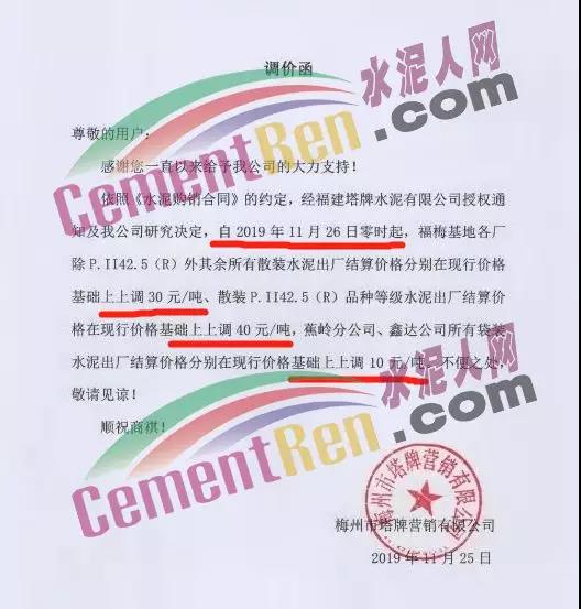 梅州市塔牌營銷有限公司發(fā)布了調(diào)價函稱,依照《水泥購銷合同》的約定,決定自2019年11月26日零時起,福梅基地各廠除P.II42.5(R)外其余所有散裝水泥出廠結(jié)算價格在現(xiàn)行價格基礎(chǔ)上上調(diào)30元/噸,散裝P.II42.5(R)品種等級水泥出廠結(jié)算價格在現(xiàn)行價格基礎(chǔ)上上調(diào)40元/噸,蕉嶺分公司、鑫達(dá)分公司所有袋裝水泥出廠結(jié)算價格分別在現(xiàn)行價格基礎(chǔ)上上調(diào)10元/噸。