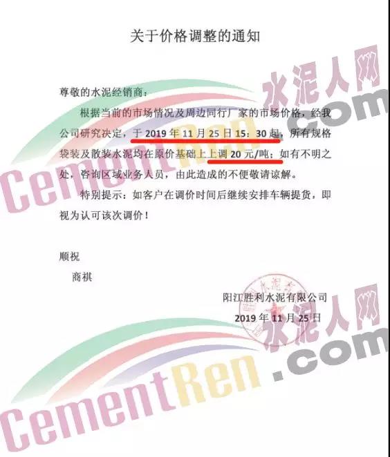 陽江勝利水泥有限公司發(fā)布了關(guān)于價格調(diào)整通知稱,根據(jù)當(dāng)前的市場情況及周邊同行廠家的市場價格,于2019年11月25日15:30起,所有規(guī)格袋裝及散裝水泥均在原價基礎(chǔ)上上調(diào)20元/噸。