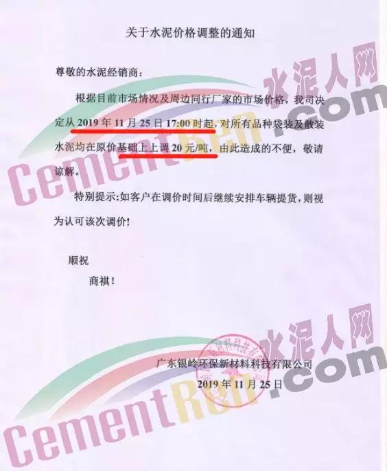 廣東銀鈴環(huán)保新材料科技有限公司發(fā)布了關(guān)于水泥價格調(diào)整的通知稱,根據(jù)市場情況及周邊同行廠家的市場價格,決定從2019年11月25日17:00時起,對所有品種袋裝及散裝水泥均在原價基礎(chǔ)上上調(diào)20元/噸。
