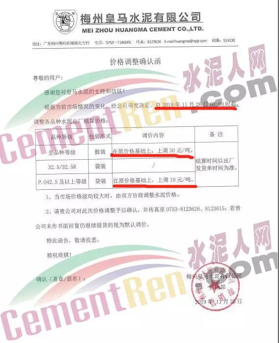 梅州市皇馬水泥有限公司發(fā)布了價格調(diào)整確認(rèn)函,根據(jù)當(dāng)前市場情況變化,決定自2019年11月26日00:00時起,全品種等級散裝在原價基礎(chǔ)上,上調(diào)30元/噸,P.O42.5及以上等級袋裝在原價格基礎(chǔ)上,上調(diào)10元/噸。