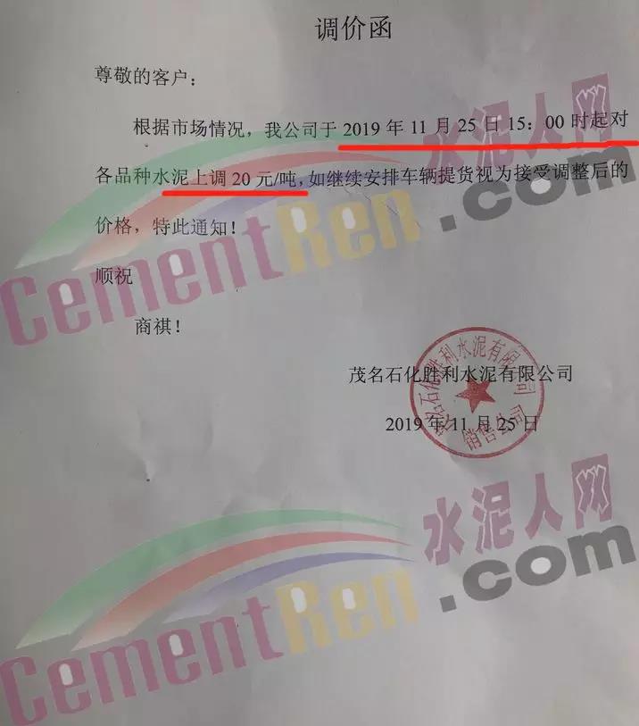 茂名石化勝利水泥有限公司發(fā)布了調(diào)價函稱,根據(jù)市場情況,于2019年11月25日15:00時起對品種水泥上調(diào)20元/噸。