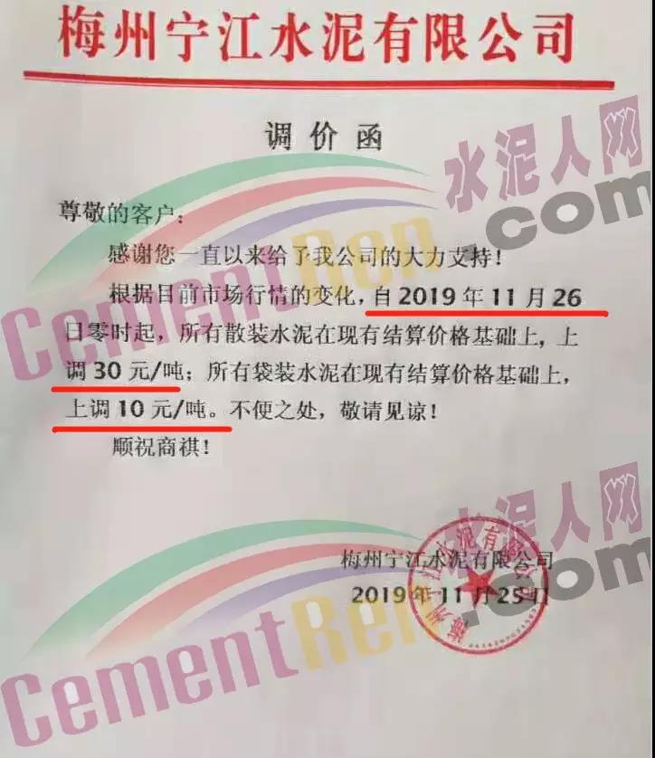 梅州市寧江水泥有限公司發(fā)布了調(diào)價函稱,根據(jù)目前市場行情變化,自2019年11月26日零時起,所有散裝水泥在現(xiàn)有結(jié)算的價格基礎(chǔ)上,上調(diào)30元/噸,所有袋裝水泥在現(xiàn)有結(jié)算價格基礎(chǔ)上,上調(diào)10元/噸。