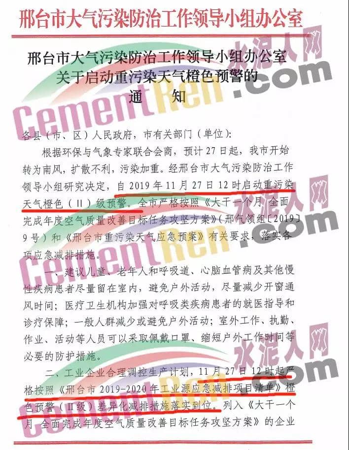 據(jù)水泥人網(wǎng)消息,昨日(11月26日)水泥大省河北省邢臺(tái)市大氣污染防治工作領(lǐng)導(dǎo)小組辦公室發(fā)布《關(guān)于啟動(dòng)重污染天氣橙色預(yù)警的通知》稱,自2019年11月27日12時(shí)啟動(dòng)重污染天氣橙色(II)級(jí)預(yù)警。本次啟動(dòng)重污染天氣距離上次解除重污染天氣僅僅只有3天時(shí)間。