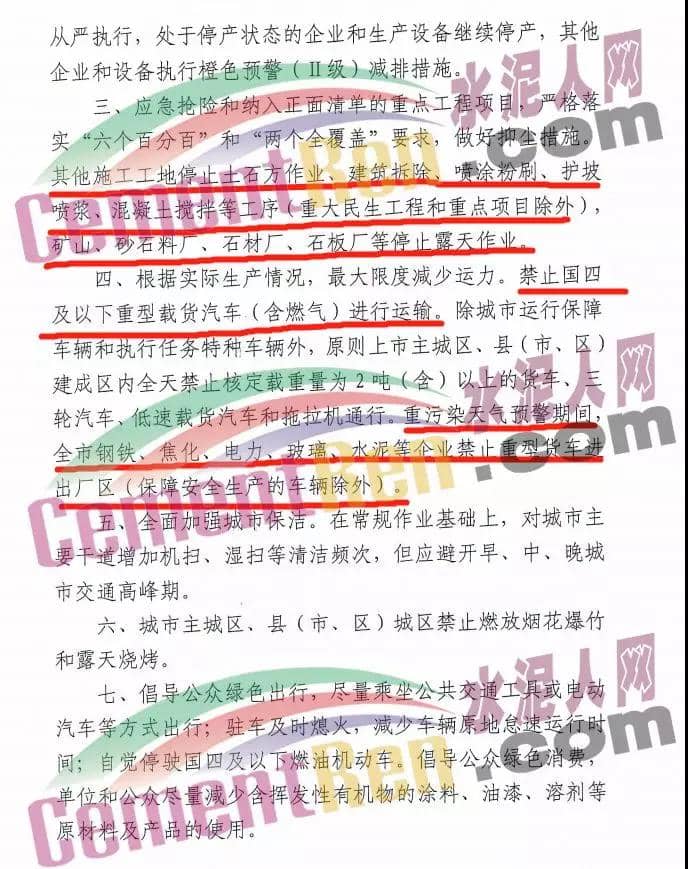 應(yīng)急搶險(xiǎn)和納入正面清單的重點(diǎn)工程項(xiàng)目,嚴(yán)格落實(shí)“六個(gè)百分百”和“兩個(gè)全覆蓋”要求,做好抑塵措施。其他施工工地停止土石方作業(yè)、建筑拆除、噴涂粉刷、護(hù)坡噴漿、混凝土攪拌等工序(重大民生工程和重點(diǎn)項(xiàng)目除外),礦山、砂石料廠、石材廠、石板廠等停止露天作業(yè)?! 「鶕?jù)實(shí)際生產(chǎn)情況,最大限度減少動(dòng)力。禁止國(guó)四及以下重型載貨汽車(含燃?xì)?進(jìn)行運(yùn)輸。除城市運(yùn)行保障車輛和執(zhí)行任務(wù)特種車輛外,原則上市主城區(qū)、縣(市、區(qū))建成區(qū)內(nèi)全天禁核定載重量為2噸(含)以上貨車、三輪汽車、低速載貨汽車和拖拉機(jī)通行。重污染天氣預(yù)警期間,全市鋼鐵、焦化、電力、玻璃、水泥等企業(yè)禁止重型貨車進(jìn)出廠區(qū)(保障安全生產(chǎn)的車輛除外)。全文如下: