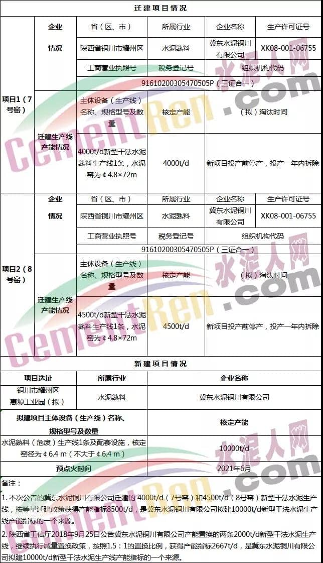 經(jīng)審核,冀東水泥銅川有限公司4000t/d新型干法熟料水泥生產(chǎn)線和4500t/d新型干法熟料水泥生產(chǎn)線符合“因當?shù)匕l(fā)展規(guī)劃調(diào)整,導(dǎo)致不屬于國家明令淘汰的落后產(chǎn)能的生產(chǎn)裝置遷建的,且企業(yè)持有的生產(chǎn)許可證仍在有效期內(nèi),企業(yè)搬遷又未享受退出產(chǎn)能的資金獎補和政策支持,企業(yè)承諾確不新增產(chǎn)能”要求。公示原文如下:
