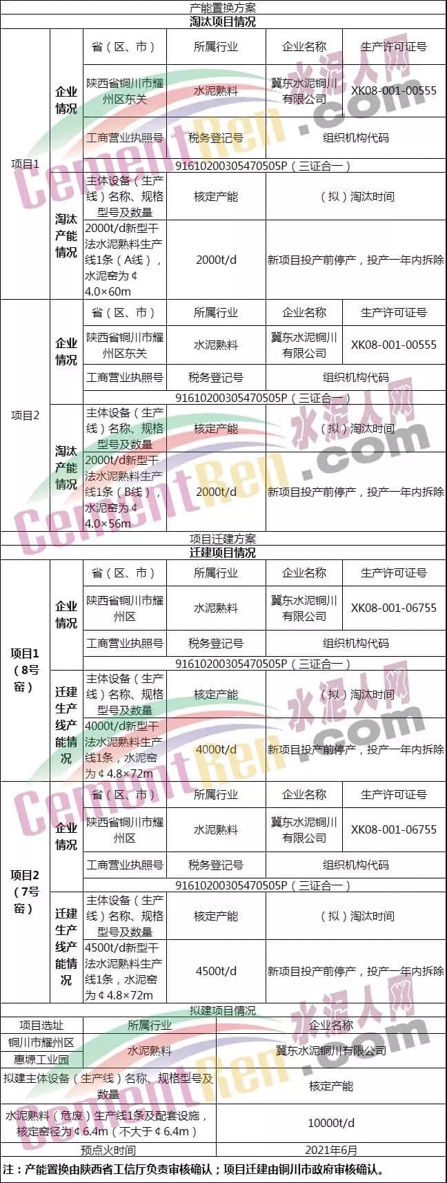 11月22日,陜西省工業(yè)和信息化廳發(fā)布了《關(guān)于冀東水泥銅川有限公司置換方案調(diào)整公告》稱,按照《國務(wù)院關(guān)于化解產(chǎn)能嚴重過剩矛盾的指導(dǎo)意見》(國發(fā)〔2013〕41號)和《工信部水泥行業(yè)產(chǎn)能置換實施辦法》(工信部原〔2017〕337號)精神,以及工信部《關(guān)于陜西省水泥企業(yè)能否執(zhí)行退城入園政策的復(fù)函》(工原函〔2019〕383號)要求,現(xiàn)將冀東水泥銅川有限公司產(chǎn)能置換方案進行調(diào)整公告,置換項目在新建項目投產(chǎn)前必須關(guān)停退出,投產(chǎn)一年內(nèi)必須拆除。產(chǎn)能置換方案如下: