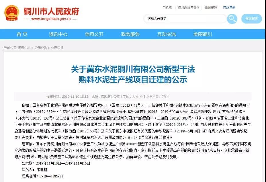 11月10日,陜西省銅川市人民政府發(fā)布《關(guān)于冀東水泥銅川有限公司新型干法熟料水泥生產(chǎn)線項目遷建的公示》稱,為加快藥王山景區(qū)建設(shè),將對冀東水泥銅川有限公司原5、6、7、8號窯進行搬遷建設(shè)。