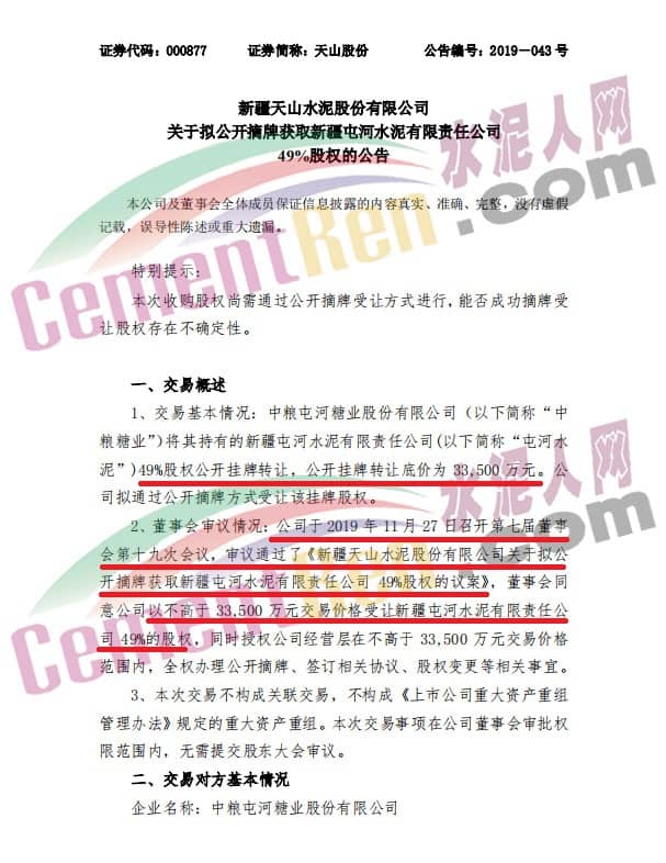 同日,天山股份也發(fā)布公告稱,中糧糖業(yè)將其持有的新疆屯河水泥有限責(zé)任公司49%股權(quán)公開掛牌轉(zhuǎn)讓,公開掛牌轉(zhuǎn)讓底價(jià)為33,500萬元。天山公司擬通過公開摘牌方式受讓該掛牌股權(quán)。目前,天山公司持有屯河水泥51%股權(quán),屯河水泥是天山股份新疆北疆片區(qū)的重要支撐,本次股權(quán)收購符合公司產(chǎn)業(yè)布局和戰(zhàn)略發(fā)展要求。