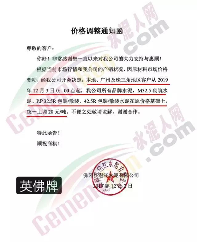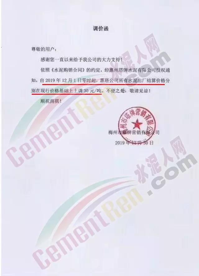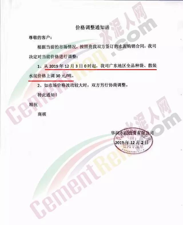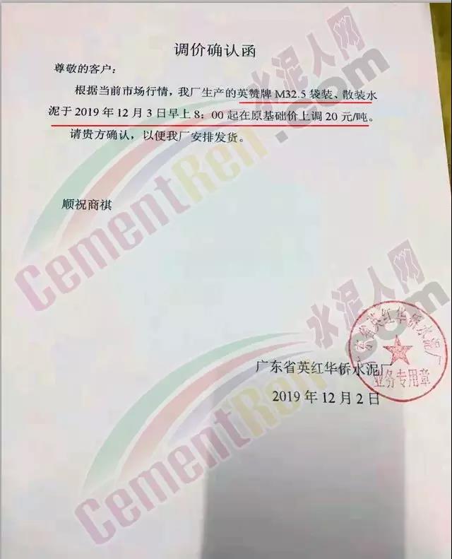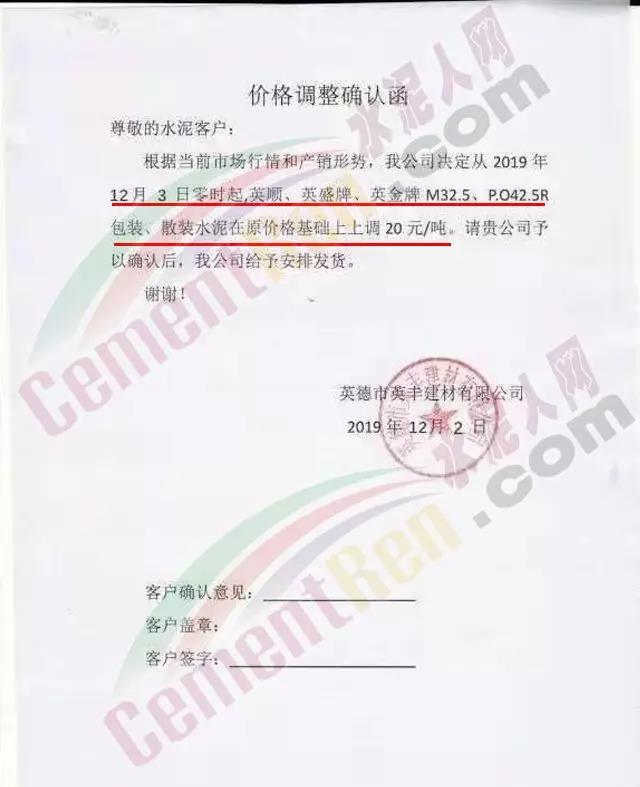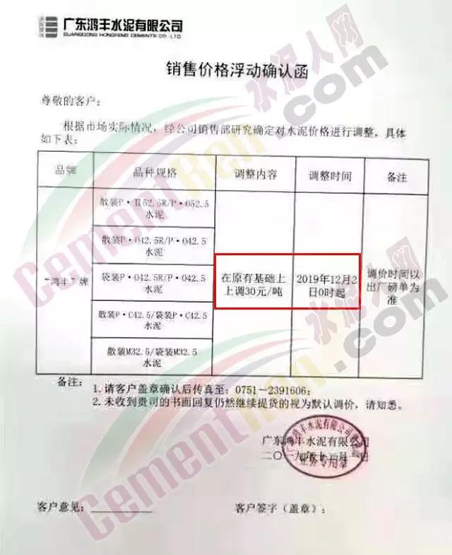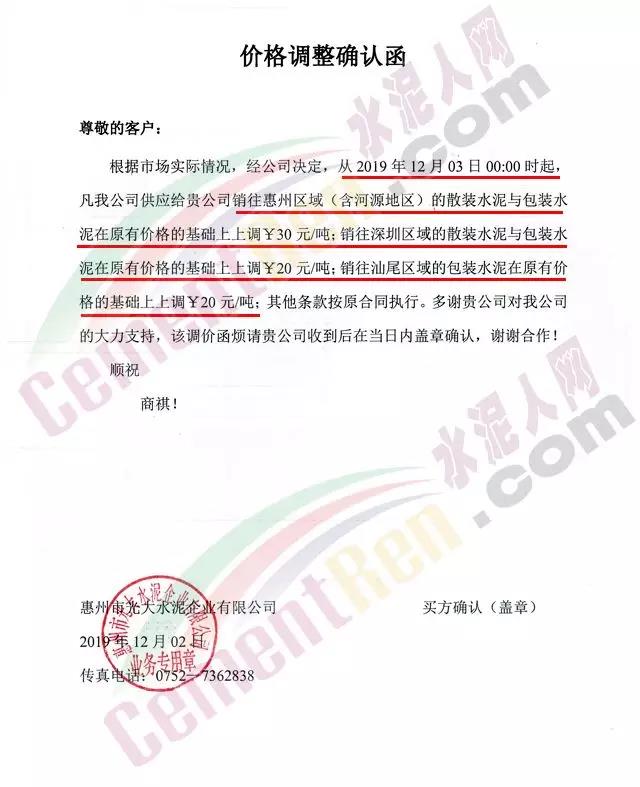 惠州光大水泥價(jià)格調(diào)整確認(rèn)函稱(chēng),自12月3日起銷(xiāo)往惠州區(qū)域(含河源地區(qū))的散裝水泥與包裝水泥在原價(jià)基礎(chǔ)上上調(diào)30元/噸;銷(xiāo)往深圳區(qū)域的上調(diào)20元/噸,銷(xiāo)往汕尾區(qū)域的包裝水泥在原價(jià)格基礎(chǔ)上上調(diào)20元/噸。