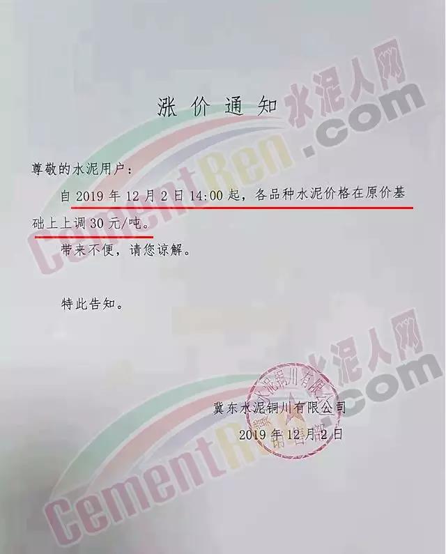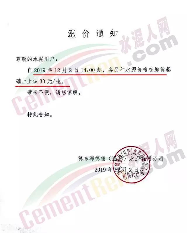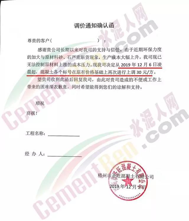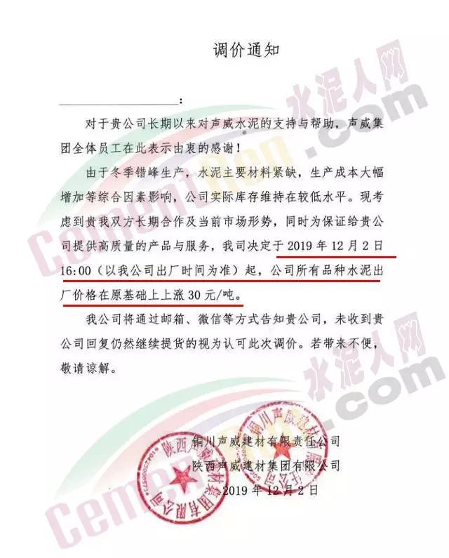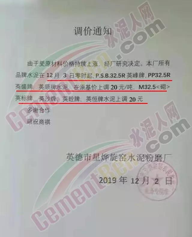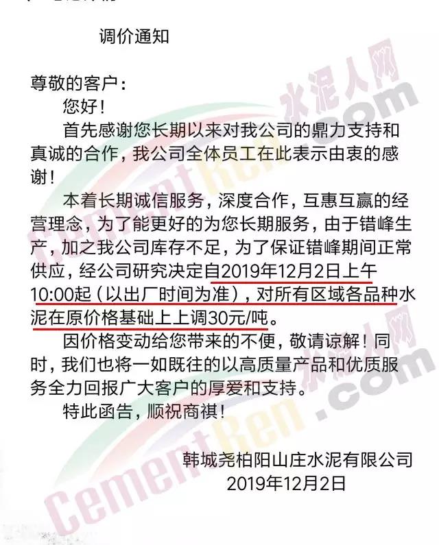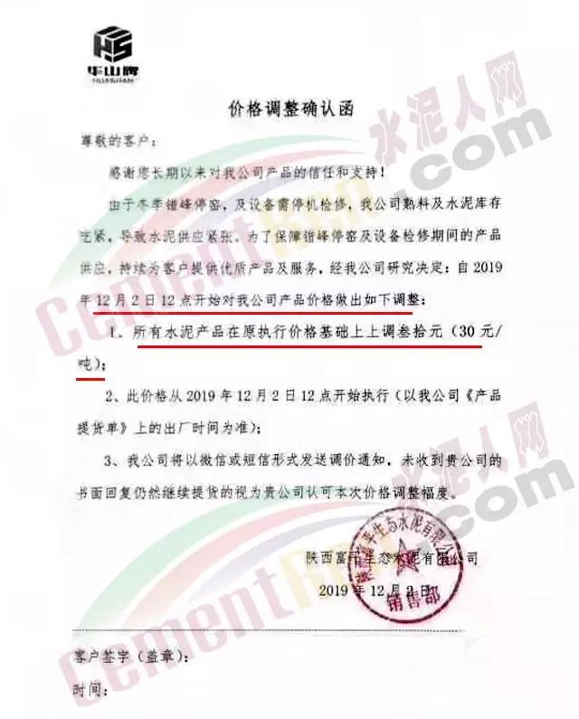 惠州光大水泥價(jià)格調(diào)整確認(rèn)函稱(chēng),自12月3日起銷(xiāo)往惠州區(qū)域(含河源地區(qū))的散裝水泥與包裝水泥在原價(jià)基礎(chǔ)上上調(diào)30元/噸;銷(xiāo)往深圳區(qū)域的上調(diào)20元/噸,銷(xiāo)往汕尾區(qū)域的包裝水泥在原價(jià)格基礎(chǔ)上上調(diào)20元/噸。