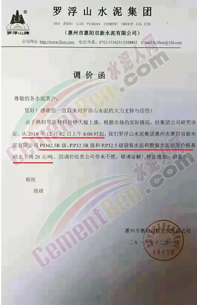 同期,廣東珠三角及周邊區(qū)域也正在進(jìn)行著一輪水泥價(jià)格普漲。其中羅浮山水泥集團(tuán)惠州市惠陽(yáng)雙新水泥有限公司調(diào)價(jià)函稱(chēng),由于熟料等原材料價(jià)格大幅上漲,根據(jù)市場(chǎng)實(shí)際情況,經(jīng)集團(tuán)公司研究決定自12月2日上午8時(shí)起,羅浮山集團(tuán)惠陽(yáng)雙新水泥有限公司水泥價(jià)格上調(diào)20元/噸。